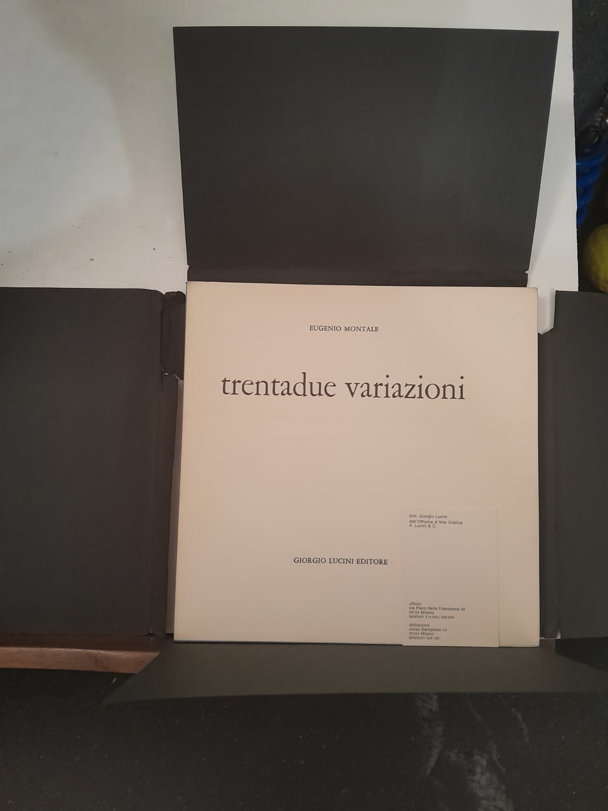 Portfolio contenente 32 fogli a 4 pagine ciascuno numerati in sequenza nel retro dell'ultima pagine (1 -32) ogni variazione è stampata su carta a diversi color; + altri due fogli con frontespizio e colophon con numerazione 85\250. Biglietto d'accompagno dell'Editore. Cartellina nera con rottura laterale che contiene i fogli praticamente nuovi (vedi foto).