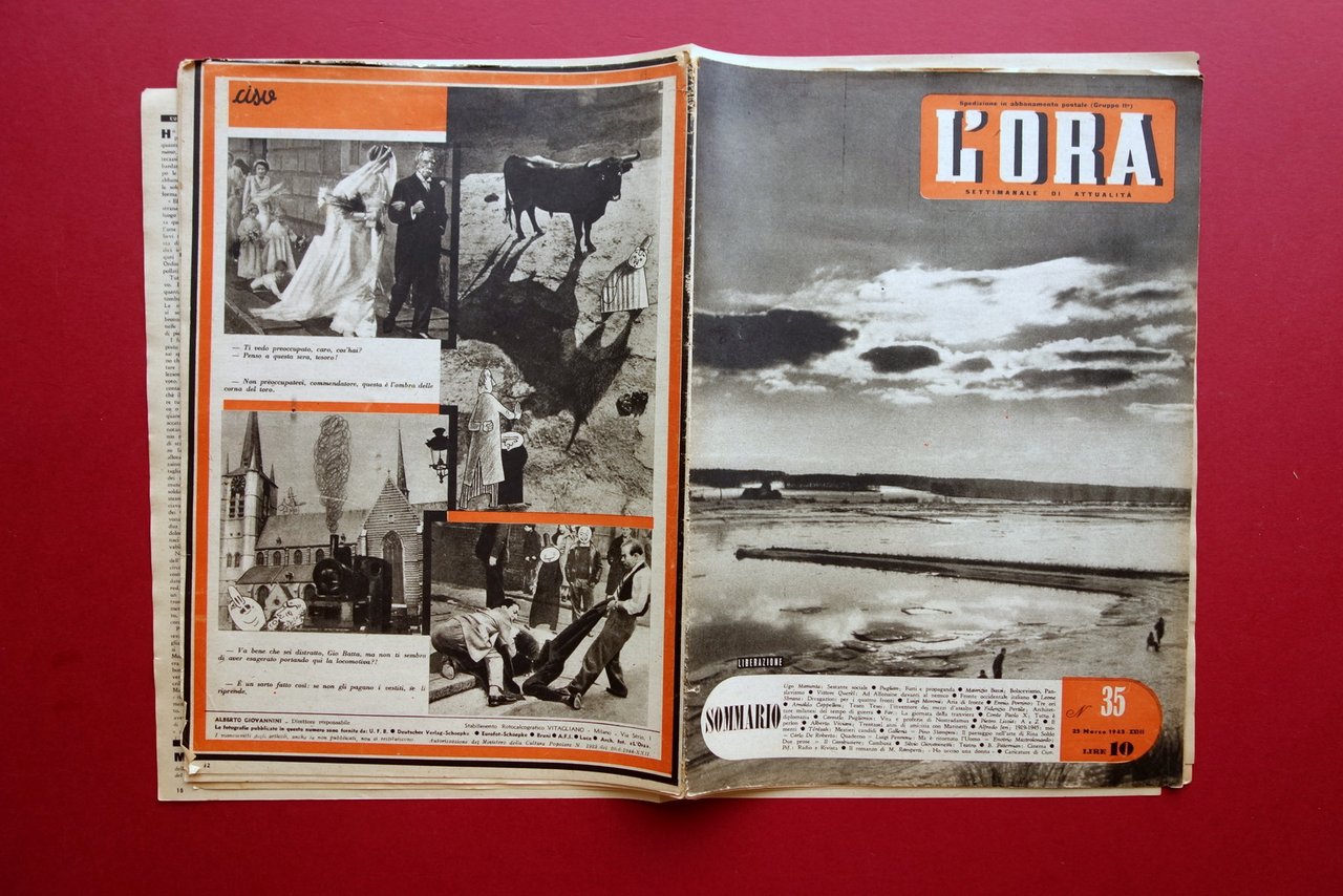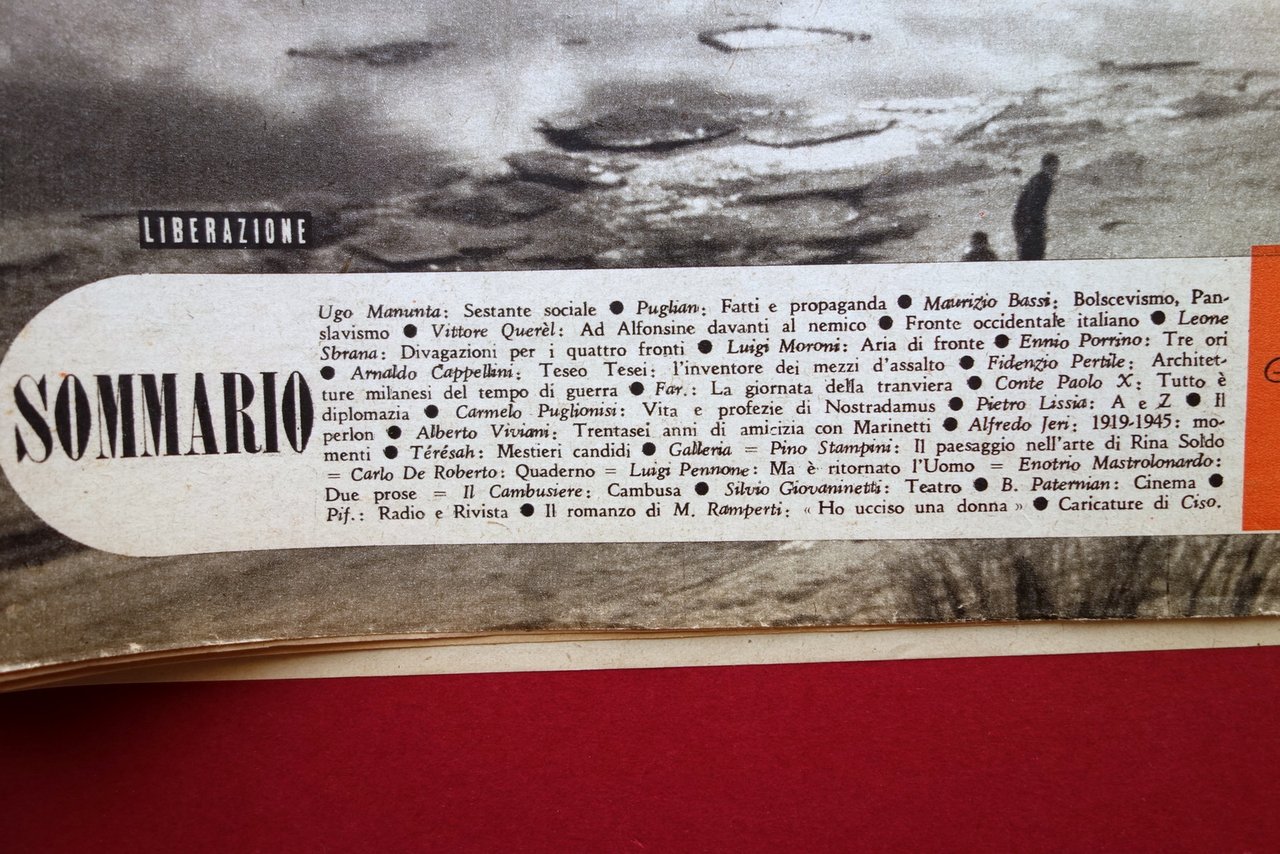 Giornale (numero unico), Trentasei anni di amicizia con Marinetti" articolo firmato Alberto Viviani (seconda parte) in "L'Ora!" settimanale di attualità anno II - numero 35 25 marzo 1945 Milano, 1945; cm 35,5x25,5; pp. 32 con numerose ill. in b/n; esemplare a fogli sciolti, ill. in b/n alla copertina. Numero completo. Condizioni di conservazione Buone condizioni con tracce d'uso, qualche minuscolo marginale difetto e strappetto ai margini delle pagine, piccoli strappetti alle cuffie. Interni complessivamente molto ben conservati con qualche pressoché trascurabile brunitura. Alle pagine 20-21 l'interessante articolo del Viviani su Marinetti (seconda parte). Numero completo di rara rivista edita durante il breve periodo della repubblica sociale italiana. SC03.D18366 N "