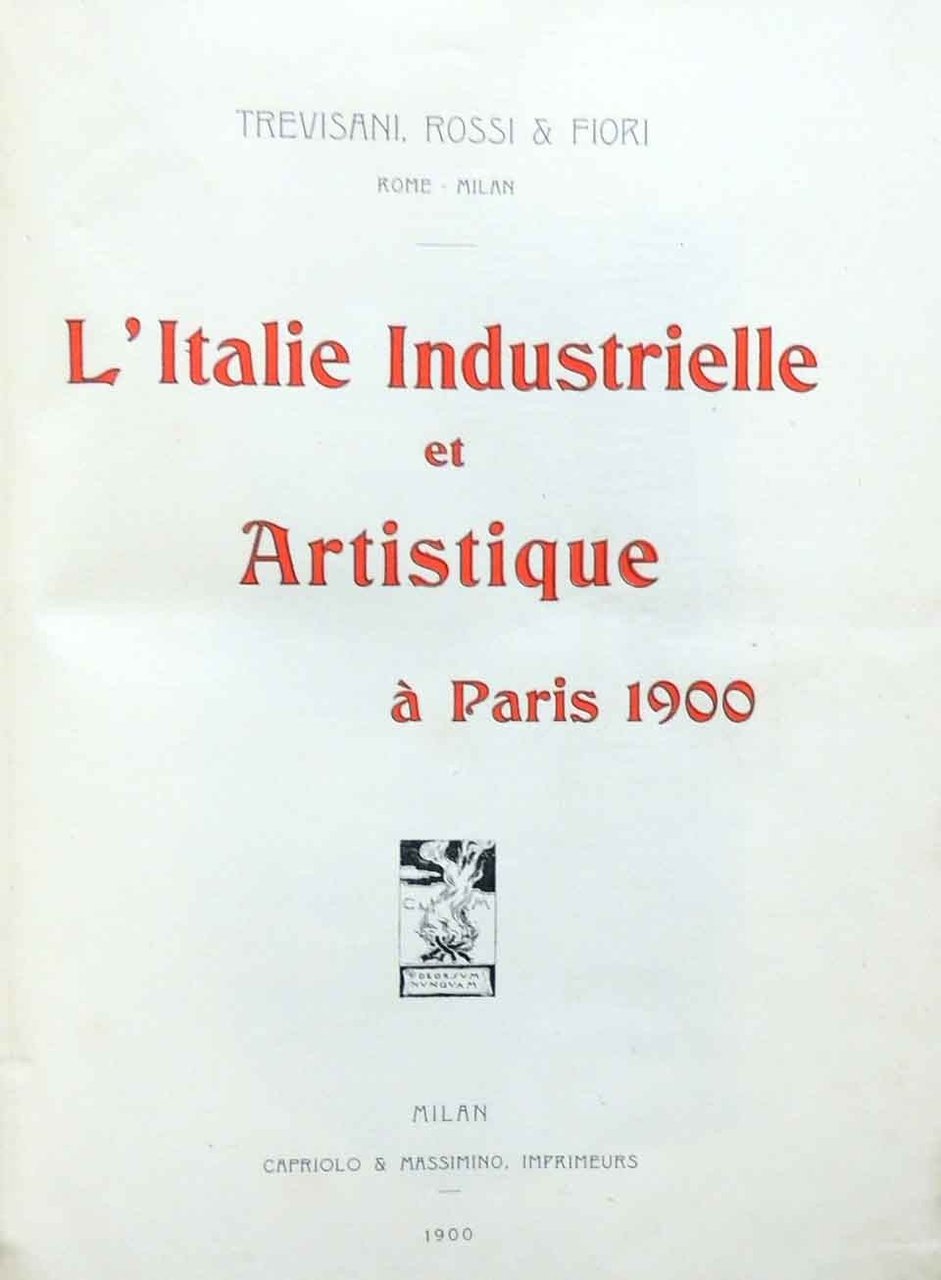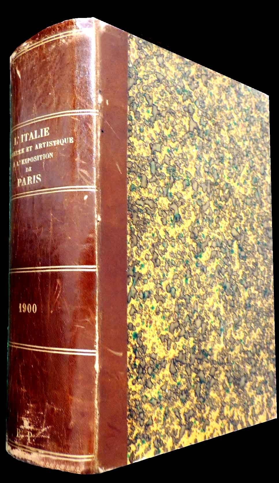 Trevisani, Rossi e Fiori – Rome-Milan, L’Italie industrielle et artistique à Paris 1900, Capriolo e Massimino imprimeurs, Milan 1900, pp. XIII, 1379, XXXVI, ill. b.n. nel testo, finalini ill. b.n., 238 c. di tavv. ill. con bellissime fotografie b.n., 8 c. di tavv. f.t. ripiegate ill. b.n., 2 c. di tavv. ill. col. con riproduzioni di manifesti della ditta Ricordi, cm 27, elegante legatura coeva in mezza pelle con titoli e filetti in oro al dorso, piatti in carta marmorizzata, angoli in pergamena e tagli spruzzati in rosso. Pubblicazione in lingua francese. Bellissimo e corposo catalogo delle ditte italiane presenti all’Esposizione Universale di Parigi del 1900. Sono presenti, tra le altre, molte ditte storiche dell’industria e della manifattura italiane, alcune delle quali ancora attive, molte invece scomparse nonostante il rilievo avuto nel tempo. Le ditte, appartenenti ai vari settori produttivi più attivi all’epoca, sono raggruppate e presentate per settori: industria mineraria, chimica, metallurgica e meccanica (comprendente grande e piccola metallurgia, genio civile e navale, industria elettrica ed elettromeccanica), manifatturiera (tra cui le manifatture di mobili e ornamenti), tessile, orafa, agricola, enologica (presenti molti liquorifici storici), alimentare, farmaceutica, produzioni legate alle arti (tipografie, cartografie, fotografia) e alla musica, ramo creditizio. Ogni sezione include l’elenco completo degli espositori e schede monografiche dedicate agli espositori maggiori. In appendice scheda monografica dedicata alle Acciaierie di Terni. Eccezionale documento storico. Minime abrasioni al dorso, antichi minimi restauri a margine di frontespizio e contro frontespizio, una piccolissima mancanza al margine di una tavola, qualche sporadico strappetto senza mancanze a margine di alcune carte interne, per il resto volume in eccezionale stato di conservazione, con interni freschi e puliti e legatura solida e ottimamente conservata. Raro.