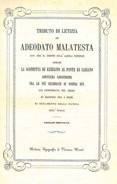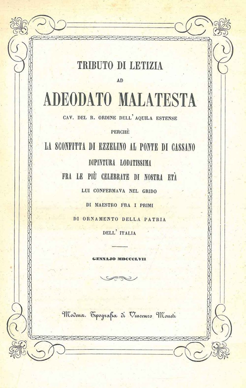Tributo di letizia ad Adeodato Malatesta cav. del R. ordine dell'Aquila estense perchè la sconfitta di Ezzelino al ponte di Cassano dipintura lodatissima fra le più celebrate di nostra età lui confermava nel grido di maestro fra i primi di ornamento dell
