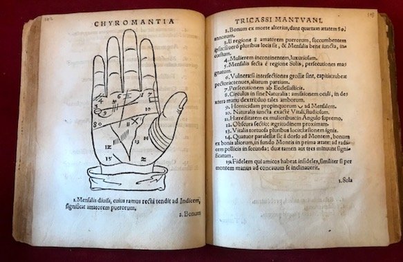 4to (cm. 17,8), 137 cc.nn. (di 138, assente l’ultima carta). Con num.se grandi illustrazioni xilografiche raffiguranti mani chiromantiche. Legatura coeva in piena pelle (molto usurata e con piatti staccati) entro custodia moderna. Margine esterno del frontespizio con ampio restauro integrativo senza perdita di testo ma di parte della testata xilografica. Lievi aloni, alcune glosse di mano antica e qualche brunitura. Ultime trenta carte con margine esterno rinforzato. Modesto esemplare. Opera rara censita da ICCU in due sole biblioteche italiane. Cfr. Adams, T-940. Non in Caillet.