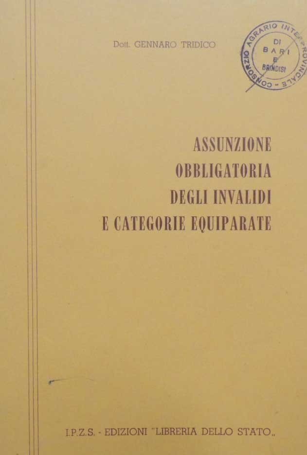Gennaro Tridico, Raccolta legislativa delle disposizioni concernenti l’assunzione obbligatoria degli invalidi e categorie equiparate presso le pubbliche amministrazioni e le aziende private, I.p.z.s. (Istituto Poligrafico e Zecca dello Stato) – Edizioni Libreria dello Stato, Roma 1979, pp. IX, 397, cm 20, br. ed. Timbro di biblioteca estinta alla prima di copertina. Minime tracce d’uso, qualche sporadico segnetto di lapis, per il resto perfetto.