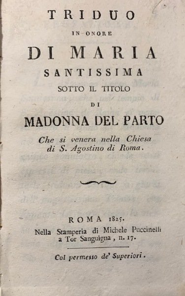 In 12°; 20 pp. Senza brossura ma non slegato. In buono stato di conservazione. Prima rara edizione di questo triduo dedicato alla celebre cinquecentesca statua della Madonna del Parto realizzata da Jacopo Tatti, detto il Sansovino, conservata nella Basilica di Sant'Agostino in Campo Marzio. La statua ebbe una storia del tutto particolare e varie sono le leggende ad essa collegate. Raro.