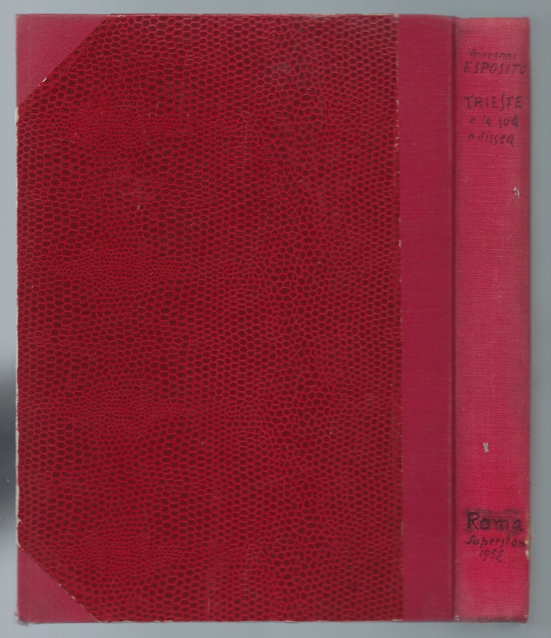 Rilegatura artigianale in mezza tela rossa con angoli e piatti rivestiti in similpelle.