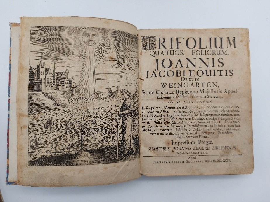 In 8 (cm 15,5 x 20), pp. (14) + 264 con 1 tavola incisa all'antiporta. Qualche forellino alla tavola, al frontespizio e ai 4 fogli successivi. Pagine uniformemente brunite. Cartonatura decorata novecentesca con danni riparati alle cerniere. Edizione originale, poco comune, di quest'opera di diritto feudale del magistrato e giurista boemo J. J. von Weingarten (1629-1701).