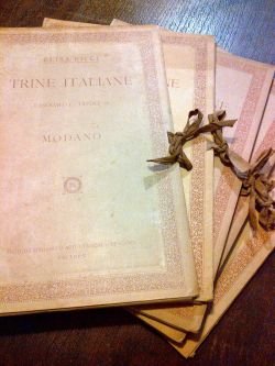 6 cartelle editoriali in-4° (cm. 34) in m. tela con decorazioni e laccetti, ognuna contenente 1 frontespizio e 24 tavole illustrative sciolte in ottimo stato (fasc. IV senza front. e con 16 tavole di 24). Fascicolo I-Modano; II-Modano, Fili tirati e Buratto; III-Reticello; IV-Reticello; V-Trine a fuselli; VI-Trine a fuselli. Interessante Set, buon esemplare. (NH10)