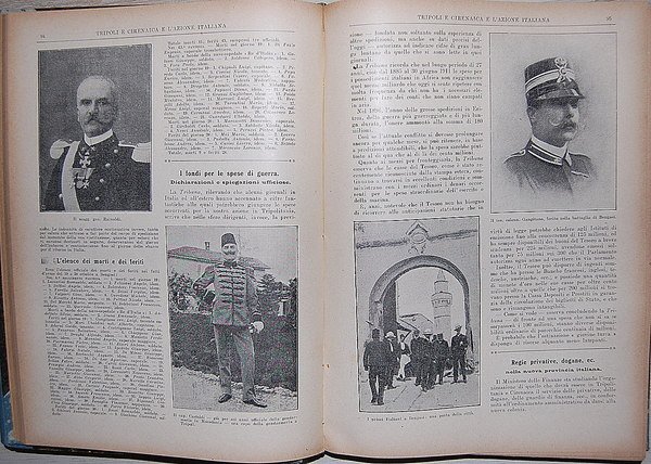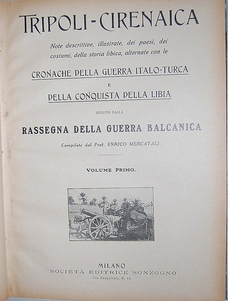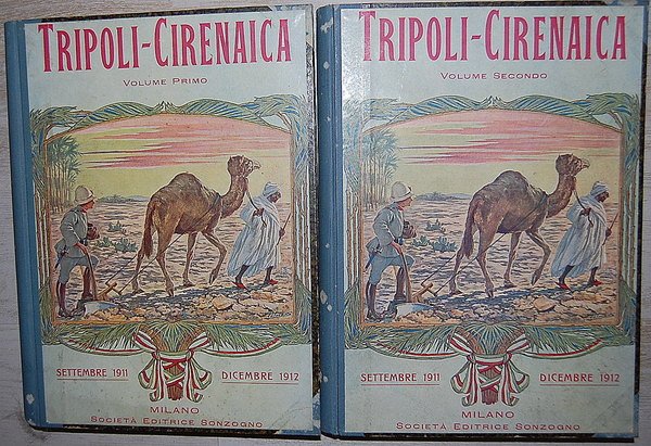 In 4° (28,8x21 cm); due tomi: XXIV, 504 pp. e (4), 504-1008 pp. Legatura coeva in mezza tela con applicata al piatto anteriore la brossura editoriale. Prima non comune edizione di questa celebre descrizione, ricchissima foto, di Tripoli e della Cirenaica durante il periodo della Guerra Italo-Turca e della conquista della Libia. L'ultima parte dell'opera è dedicata alla guerra balcanica. L'opera descrive i luoghi, i costumi e le abitudine libiche dell'epoca. Esemplare in ottime condizioni di conservazione. Non comune.