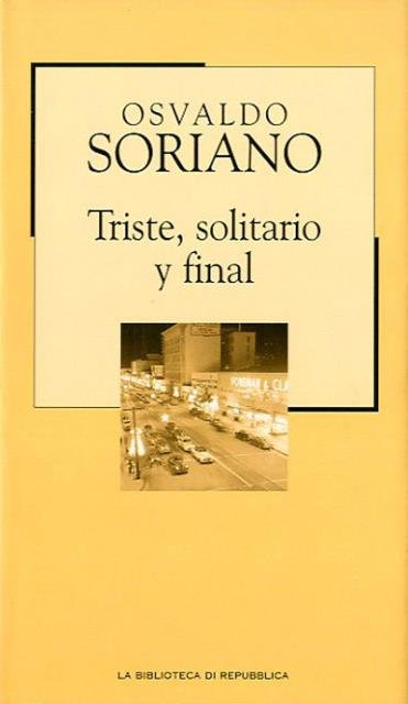 312 p. ; 21 x 13 cm. La Biblioteca di Repubblica. Novecento, 80. "Triste, solitario y final" è un romanzo di Osvaldo Soriano, pubblicato in Italia nel 1974 da Vallecchi. Il titolo è tratto dal romanzo "Il lungo addio" di Raymond Chandler: «Arrivederci, amigo. Non vi dico addio. Vi dissi addio quando significava qualcosa. Vi dissi addio quando ero triste, in un momento di solitudine e quando sembrava definitivo». Fa riferimento al personaggio di Philip Marlowe. Philip Marlowe, che in passato aveva ricevuto l'incarico dall'attore Stan Laurel di indagare sui motivi del suo declino artistico, decretato da una conventio ad excludendum, da parte delle Major di Hollywood, nei confronti dello stesso Laurel e di Oliver Hardy, viene contattato dal giornalista argentino Soriano, che sta scrivendo un libro sull'attore. Il detective, accompagnato dall'incauto giornalista, attraversa Los Angeles tra risse in stile "Stanlio e Ollio" e bevute omeriche, senza approdare a tangibili risultati investigativi. Titolo originale dell'opera: «Triste, solitario y final». Traduzione di Glauco Felici. Supplemento a "La Repubblica". Legatura editoriale, coperta in cartone rigido telato di colore azzurro, con impresso il titolo in nero al dorso, muto al piatto. Sovraccoperta di colore giallo, illustrata a colori. Qalche lieve sottolineatura a matita nelle alcune pagine. Per il resto ottimo esemplare. Codice libreria 5058.