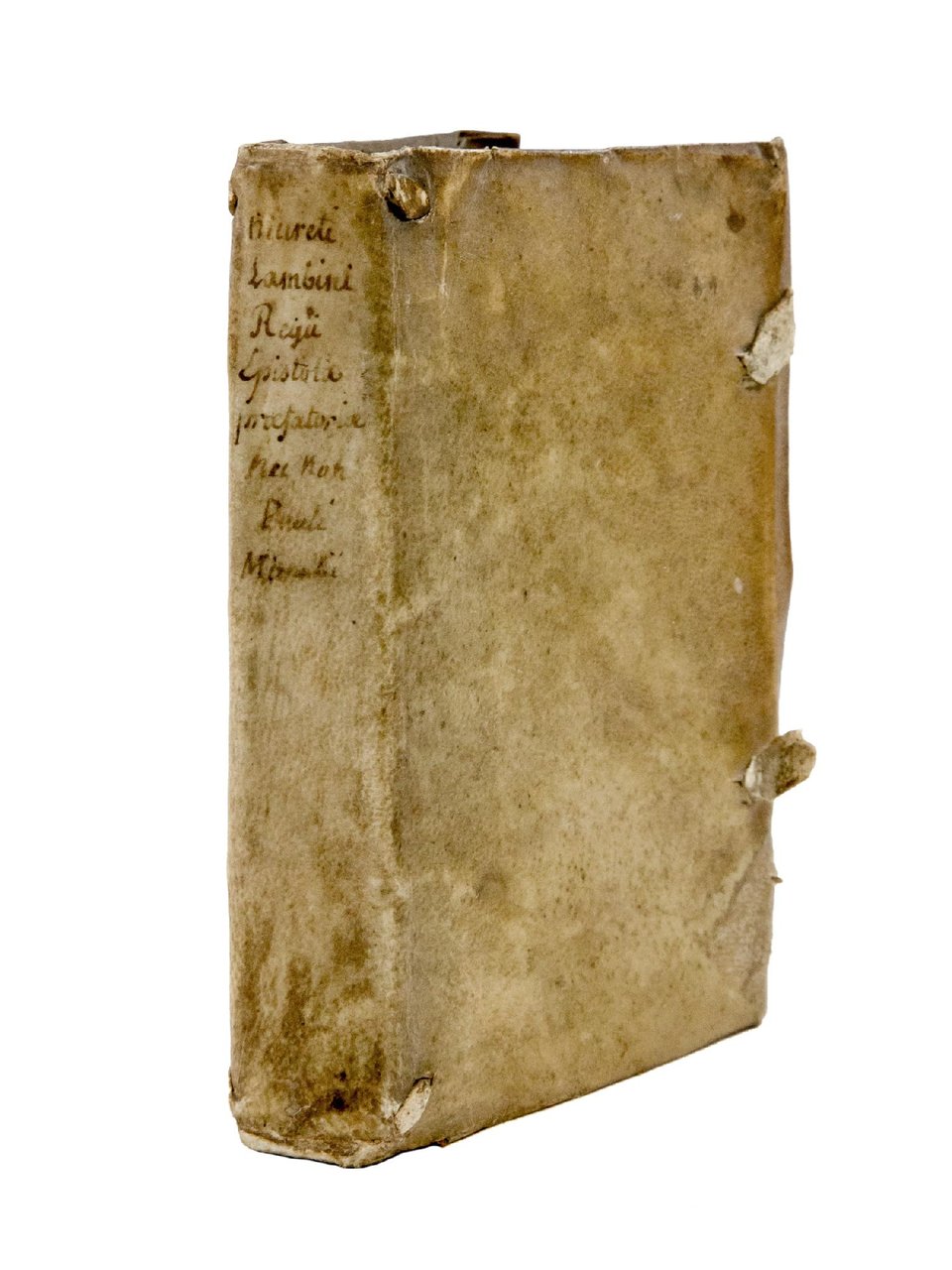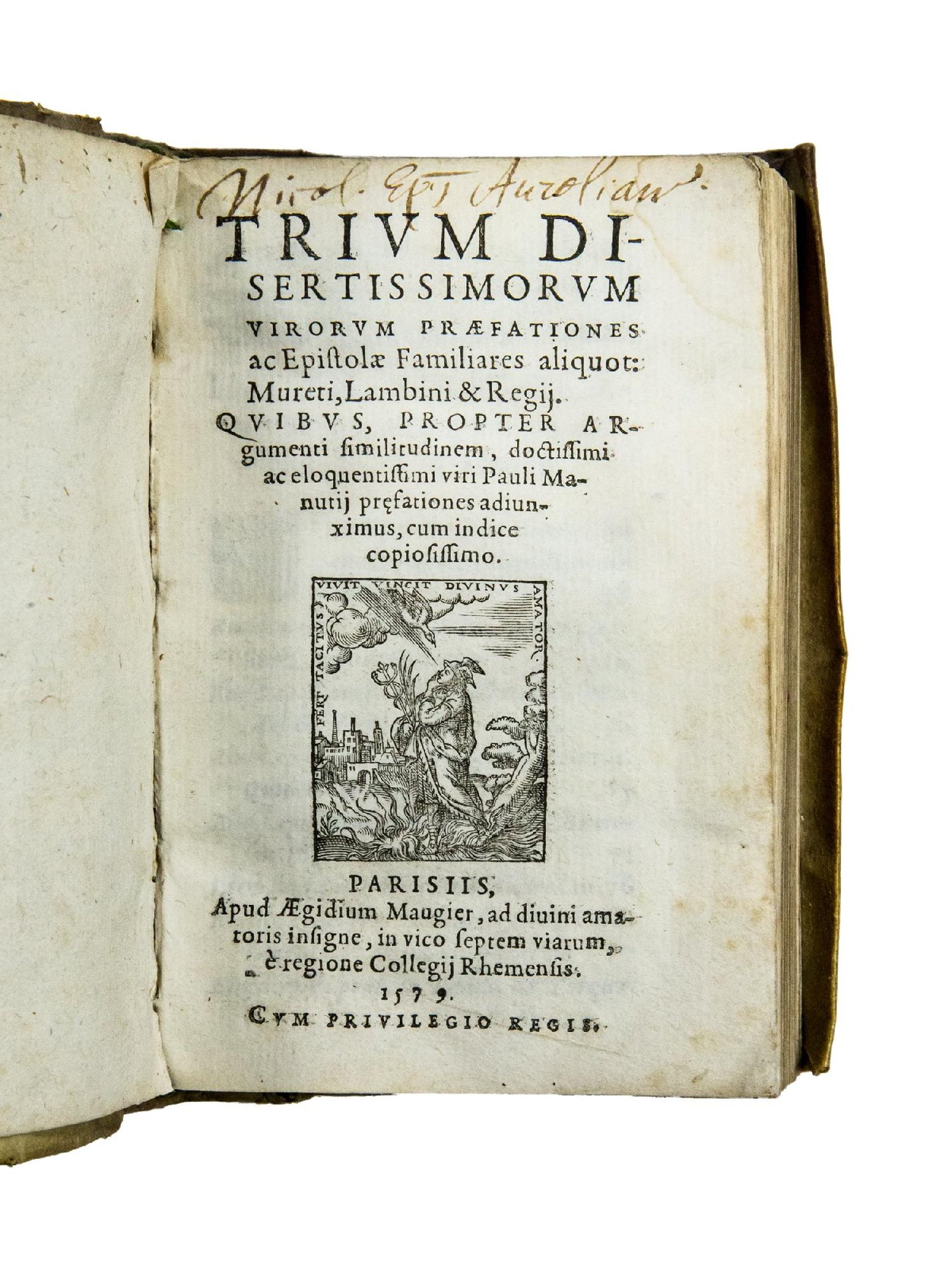 SECOND EDITION. The first edition, shared between the printers Gilles Maugier and Jean de Heuqueville, was issued in 1578 in two different formats: in octavo with a separate pagination for Manuzio's Praefationes and in small octavo with the same collation as the present edition, of which are also extant copies with Heuqueville's address.