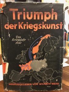 [vt] In tedesco. Trionfo dell'arte della guerra. Volume proveniente da biblioteca di commando nazista, timbro della Wehrmacht alla sguardia ant. Sovracoperta presente ma con molti strappi e mancanze, esemplare più che buono per il resto. pagg. 252,2. Mezza tela edit. con sovrac. edit. ill. Mis mm 220x150