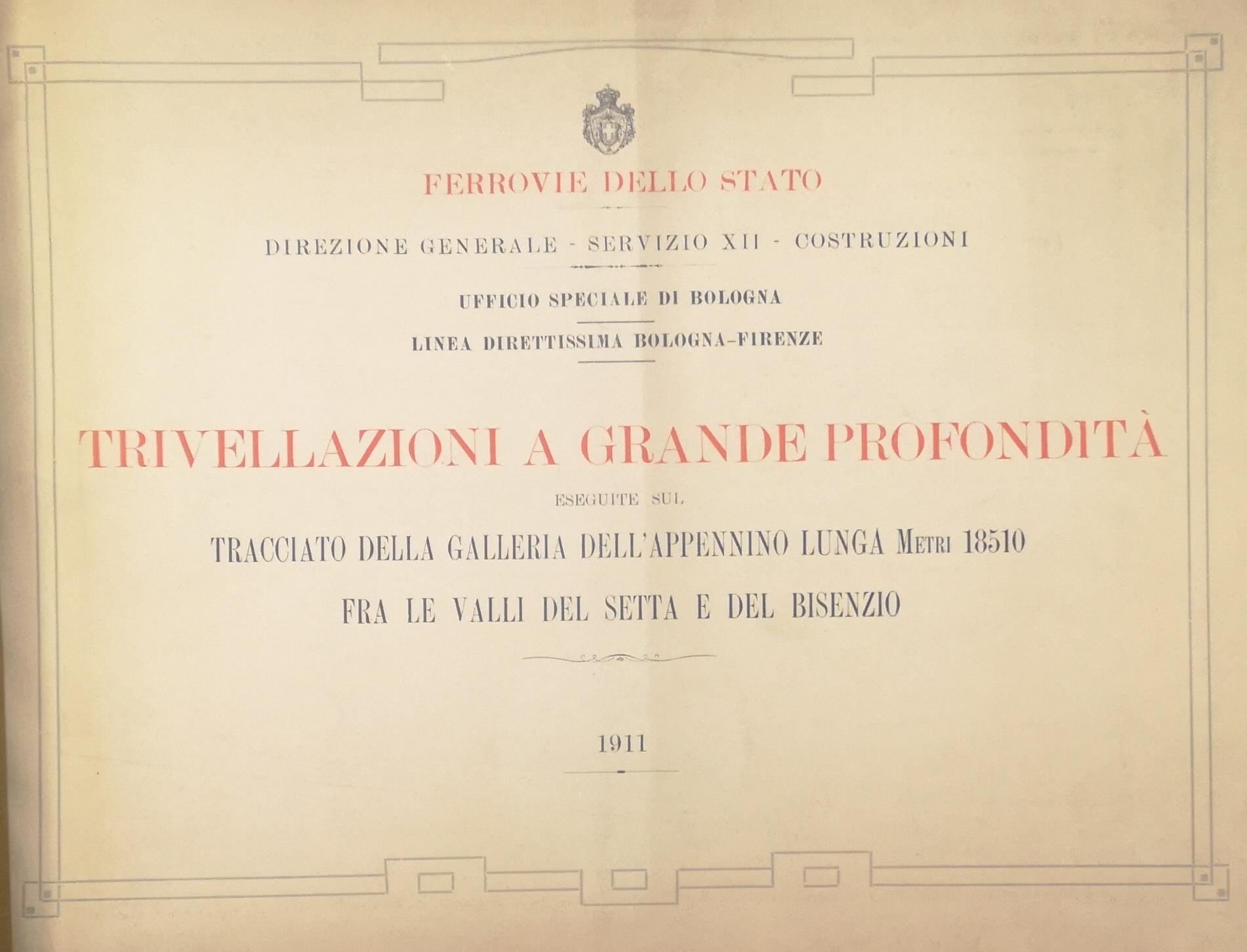 Album in-4 p. (mm. 300 x 402), cartoncino editoriale (dorso rinforzato in tela, con picc. manc.), illustrazioni in bianco e nero applicata al piatto anteriore, pp. 27, con 1 tabella più volte ripieg. che contiene i dati statistici relativi alle trivellazioni. e 22 tavole, alc. più volte ripiegate, fuori testo, ciascuna con diverse illustrazioni fotografiche in bianco e nero e figg. relative a: Corografia e profilo longitudinale della Grande Galleria dell'Appennino - Sonda a percussione rapida a bilanciere tipo Express' N. III, brevetto Fauck & C.° di Vienna, per profondità fino a 500 metri - Sonde a rotazione a tagliatori d'acciaio brevetto Davis-Calyx' della Ditta Ingersoll-Rand di New York - Metodi di asportazione continua dei detriti. - Apparecchi di salvataggio per sonde a rotazione e per sonde a percussione. Lievi manc. marginali al frontespizio, altrimenti esemplare ben conservato.
