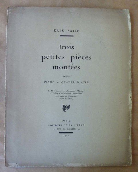 Trois Petites Pièces Montées pour Piano à quatre mains. I. De l'Enfance de Pantagruel (Rêverie). II. Marche de Cocagne (Démarche). III. Jeux de Gargantua (Coin de Polka). Première édition.