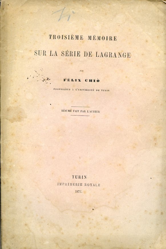 In-8°, pp. 17, brossura editoriale rosa pallido. Buon esemplare (minime gorette e fioriture). Estratto dagli 'Atti della Reale Accademia delle Scienze di Torino', VII, adunanza del 14 aprile 1872. L'opera riprende le indagini già svolte in precedenza dal matematico di Crescentino nelle sue Recherches sur la série de Lagrange (Paris, 1853), scritte su incoraggiamento di Cauchy. 'Sono ivi rettificate e completate le asserzioni del sommo matematico torinese intorno alla convergenza della sua serie e sulle radici dell'equazione risolvenda che essa è in grado di rappresentare' (Loria, Storia delle matematiche, pp. 930-931). 'Nelle memorie Recherches sur la série de Lagrange il Chio determinò alcune condizioni sotto cui la regola di convergenza data da Lagrange riesce esatta, la rende più semplice e dimostrò che il massimo da cui essa dipende si trova semplicemente usando le regole del calcolo differenziale' (Nicoletta Janiro in D.B.I., XXV, 1981). Cfr. Riccardi, I, p. VII.