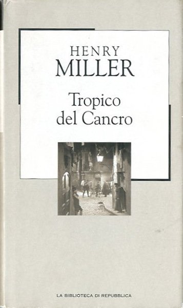 254 p. ; 21 x 13 cm. La Biblioteca di Repubblica. Novecento. È il primo romanzo scritto da Henry Miller, pubblicato per la prima volta nel 1934 dalla Obelisk Press a Parigi. Negli Stati Uniti venne pubblicato per la prima volta nel 1961 dalla Grove Press, e portò ad un processo per oscenità che spinse ad applicare e/o rivedere le leggi americane sulla pornografia degli anni sessanta. Il romanzo divenne famoso, oltre che per la sua franca e spesso dettagliata descrizione del sesso, anche per la prosa colta ed elaborata che lo fanno considerare da molti come un importante capolavoro della letteratura del ventesimo secolo. Il romanzo è ambientato nella Francia del 1930, principalmente a Parigi. È scritto in prima persona, con molti riferimenti autobiografici come altri romanzi di Miller, e spesso fluttua tra il passato ed il passato prossimo. L'ambiente parigino, luogo rutilante e pieno di mollezze da intellettuali, è anche un mondo di lavoro, di preparazione alla guerra e di confronto politico. Il protagonista sempre a caccia di qualche soldo, si muove però nel mondo degli artisti falliti e degli esiliati volontari; persone inaffidabili ed irresponsabili che vivono nelle strade, nei locali pubblici più infimi, nei postriboli, in tuguri, mangiando quando capita e stordendosi di alcool e fumo. Alcuni capitoli spesso seguono un riferimento narrativo stretto agli amici di Miller, ai colleghi ed ai posti di lavoro; altri sono scritti come delle riflessioni a flusso di coscienza. Vi sono molti passaggi che esplicitamente descrivono gli incontri sessuali del narratore, anche se il libro non si focalizza soltanto su questi argomenti. Titolo originale dell'opera: «Tropic of cancer». Traduzione di Luciano Bianciardi riveduta da Guido Almansi. Libro distribuito dal quotidiano "La Repubblica" con la collana dedicata all'Italia. Legatura editoriale, coperta in cartone rigido telato di colore blu, con impresso il titolo in nero al dorso, muto il piatto. Sovraccoperta di colore grigio, illustrata a colori. Codice libreria 3559.