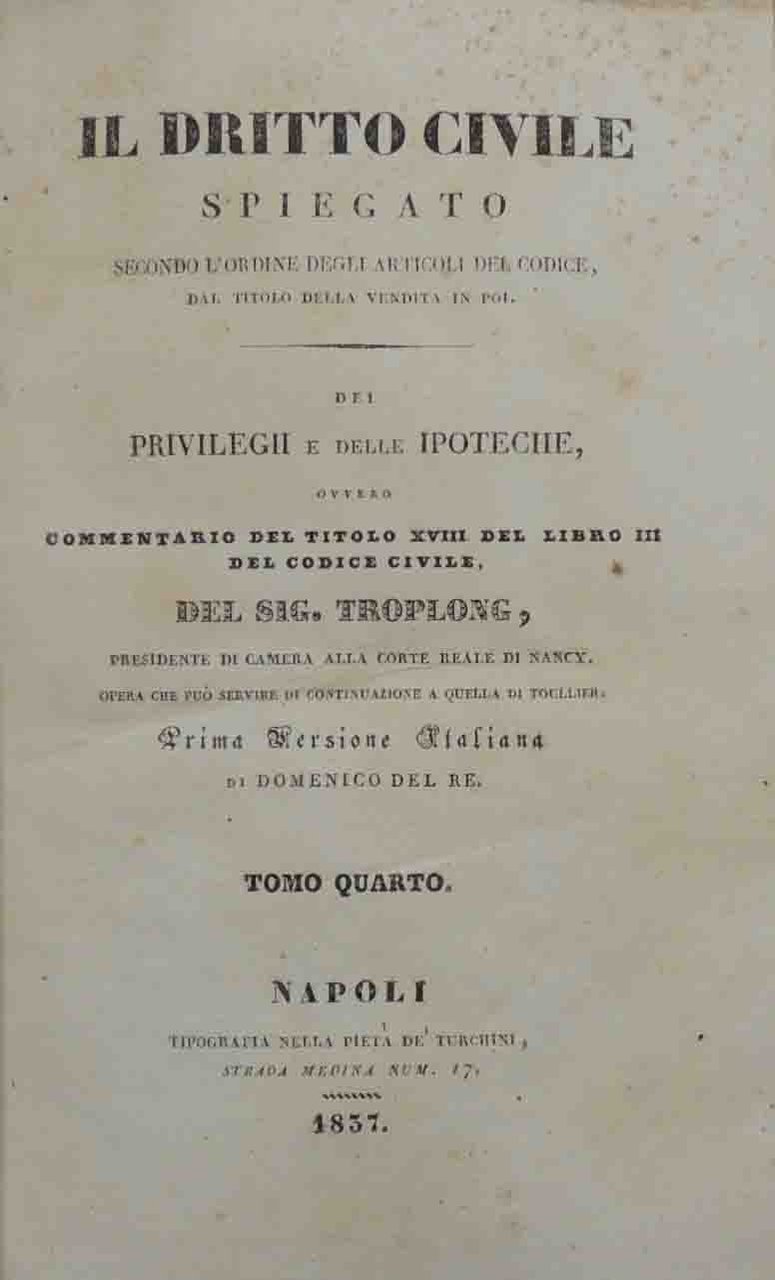 Dei privilegi e delle ipoteche, ovvero Commentario del titolo XVIII del Libro III del Codice Civile, del Sig. Troplong, Presidente di Camera alla Corte Reale di Nancy, opera che può servire di continuazione a quella di Touillier. Prima versione italiana di Domenico Del Re. Tomo quarto, Tipografia nella Pietà de’ Turchini, Napoli 1837, pp. 324, CLXXXXII, cm 22, legatura in mezza pelle con greche e titoli in oro entro tasselli al dorso, piatti in carta marmorizzata e tagli spruzzati. Fa parte di: Il diritto civile spiegato secondo l’ordine degli articoli del codice, dal titolo della vendita in poi. In appendice al volume: Note di Antonio Tortora al Commentario del Signor Presidente Troplong sul Titolo dei privilegi e delle ipoteche, pp. CLXXXXII. Opera in quattro tomi, disponibile solo il quarto tomo. Leggere tracce d’uso alla legatura, minime fioriture, per il resto copia ben conservata, con legatura solida e interni freschi e puliti. Non comune edizione napoletana di questa famosa opera.