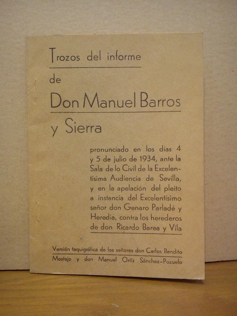 Trozos del informe de Don Manuel Barros y Sierra pronunciado en los días 4 y 5 de Julio de 1934, ante la Sala de lo Civil de la Excelentísima Audiencia de Sevilla, y en la apelación del pleito a instancia del Excelentísimo señor don Genaro Parladé y Heredia, contra los herederos de don Ricardo Barea y Vila / Versión taquigráfica de los señores don Carlos Bendito Mostajo y don Manuel Ortíz Sánchez-Pozuelo