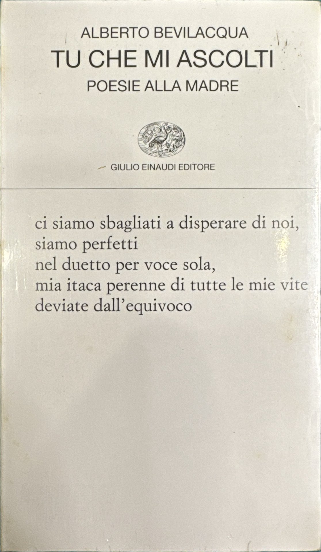 Tu che mi ascolti riunisce, in un insieme organico, le poesie che Bevilacqua ha dedicato alla figura materna nell'arco di una vita che il poeta definisce "duetto per voce sola", non interrotto oggi, a due anni dalla morte della madre. Stesso titolo per questa silloge e per il testo narrativo pubblicato lo scorso anno: registrazione degli eventi che hanno segnato una vita a due. Convinzione del poeta, infatti, è che la fine tangibile di un essere amato non spezza, in chi gli è stato alter ego, il legame relazionale: può tradursi in una sorta di misteriosa, comunicativa resurrezione.// Cop. in brossura; Einaudi; copia incellophanata; prima di effettuare l'ordine domandare per fotografie
