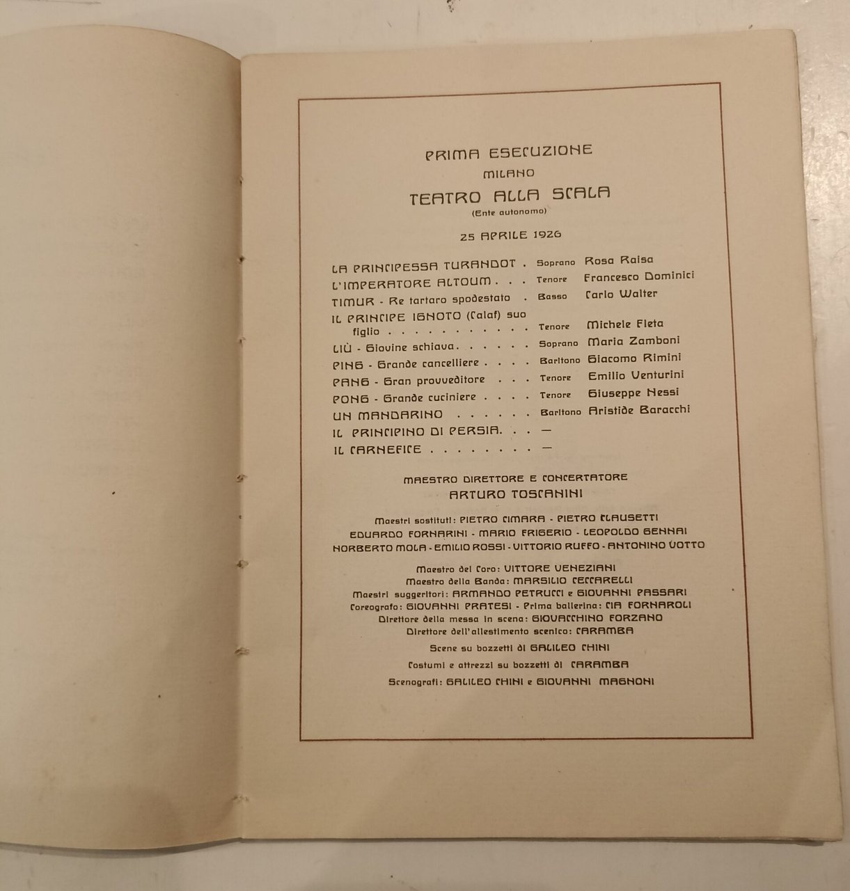In 8', br. ed., pp. 86, libretto d'opera, prima esecuzione Milano Teatro La Scala 25 aprile 1926; piatto ant. sciolto con mancanza, mancanze al dorso, pagine ingiallite, tagli bruniti, discrete condizioni. ***Due to bureaucratic reasons, books dated over 70 years old cannot be immediately exported, please contact us before placing the order.***