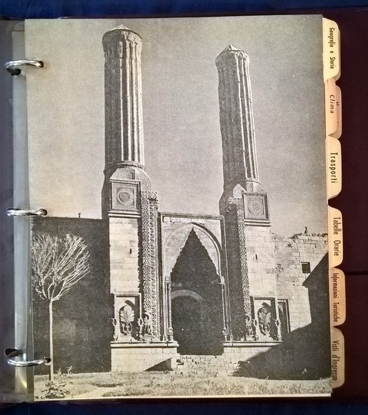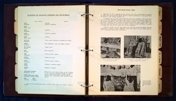 Un faldone rigido in plastica marrone-bordeaux, con titoli in oro al dorso ed al piatto ant., a tre anelli metallici, con fogli da 282x218 mm; contiene più di un centinaio di fogli, di forte spessore, riccamente illustrati in b/n, suddivisi per i seguenti argomenti: Geografia e Storia; Clima; Trasporti; Tabelle orarie; Informazioni turistiche; Visti d'ingresso; Ristoranti, Alberghi, etc.; Negozi; Maggiori eventi; Cibi e bevande; Trattenimenti; Sports; Musei; Città; Itinerari siggestivi; Carte (1 foglio più volte ripiegato con due mappe). L’anno di pubblicazione non è indicato, ma dovrebbe essere circa il 1960. Rif.: Non censito in ICCU e in OCLC. Cond.: Buon esemplare.