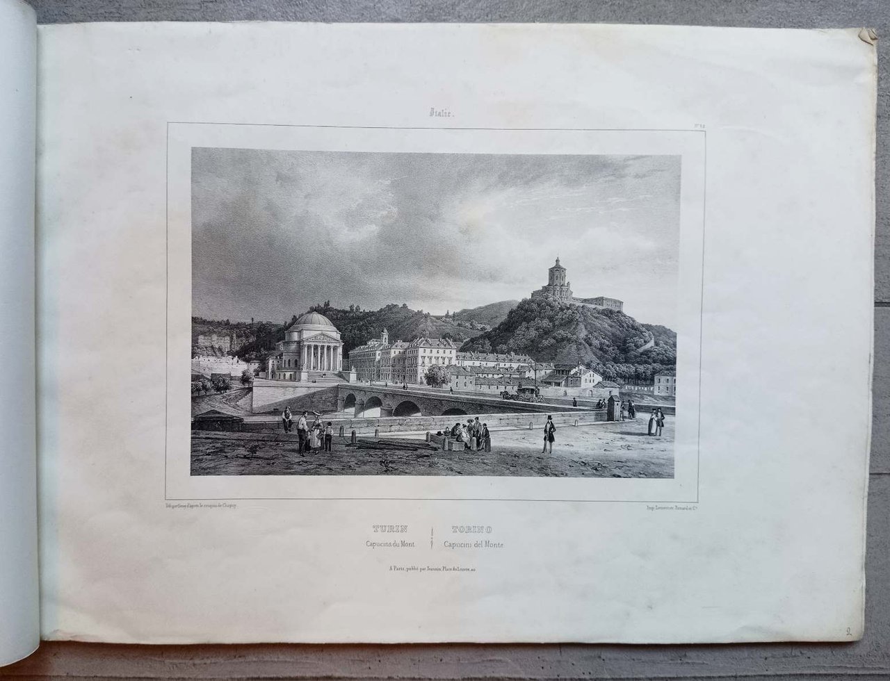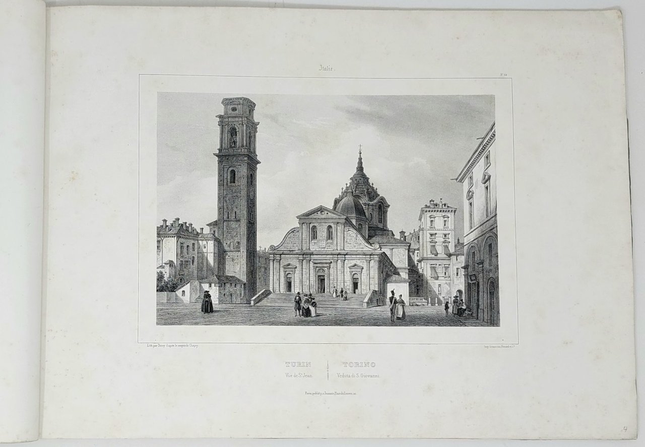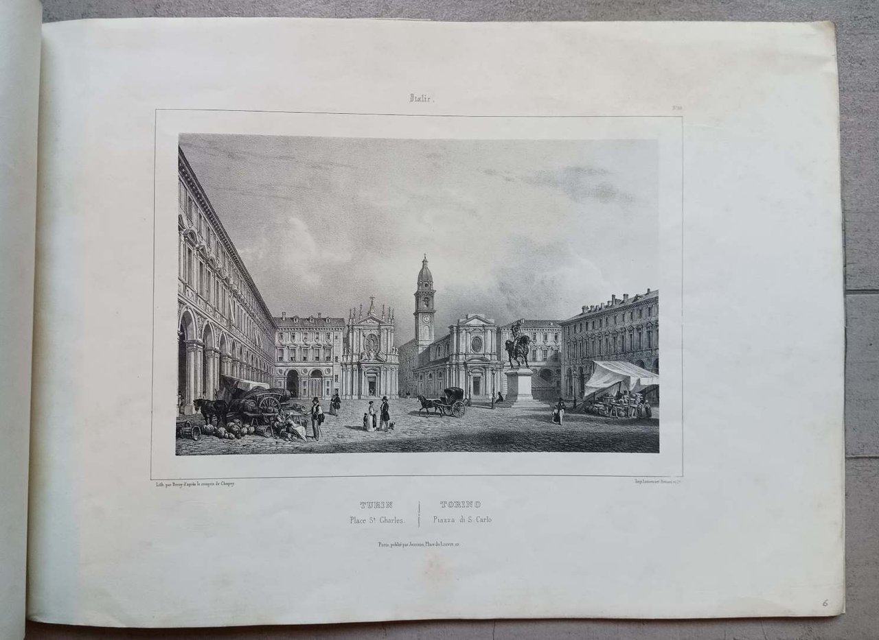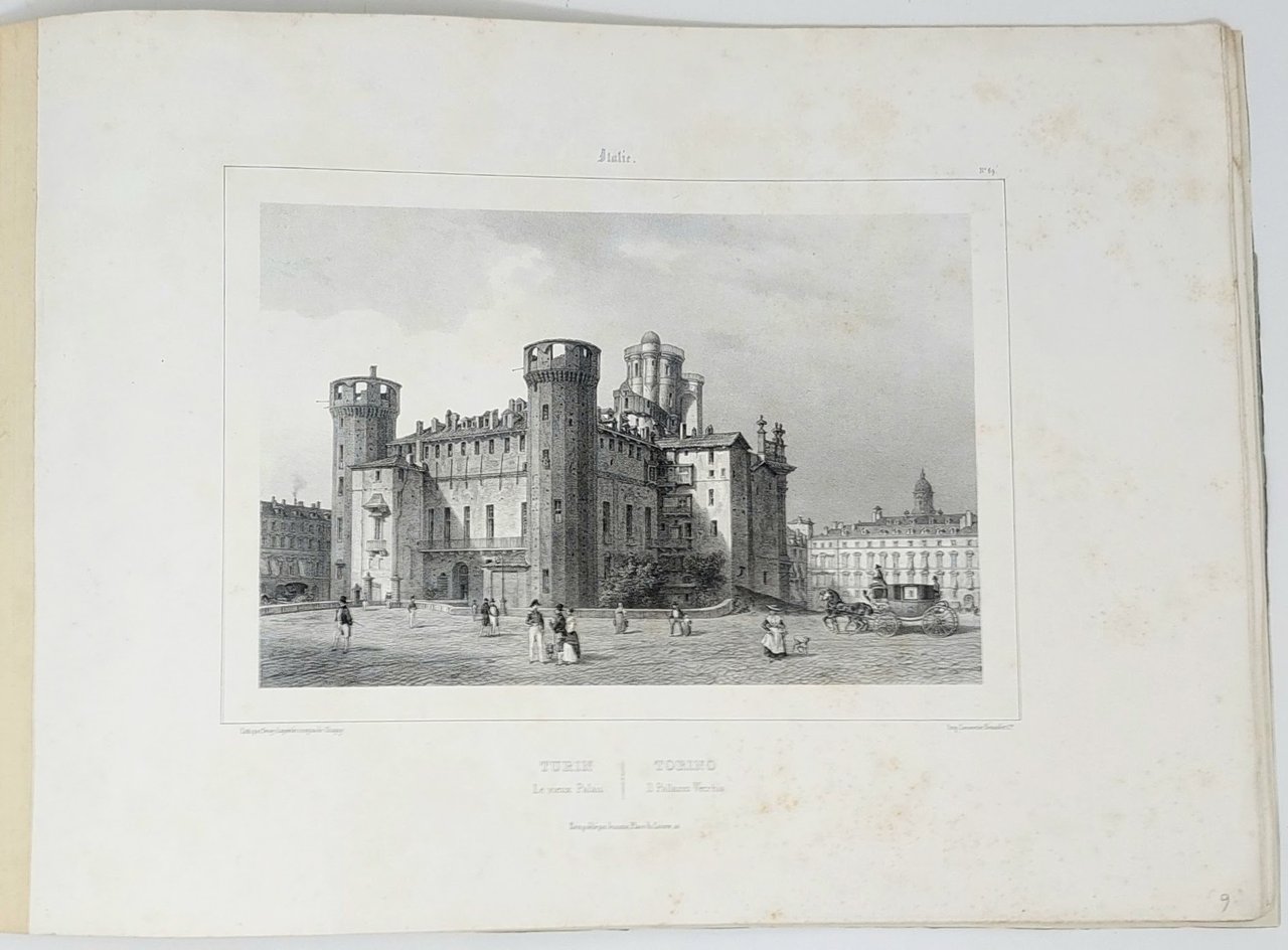 Raccolta completa, comprende le seguenti vedute con titolo in italiano e francese: 1-Turin Vue G.le prise de la ville de a Reine-Torino Veduta Gle presa della Vigna della Regina. 2-Turin Capucins du Mont/Torino Capuccini del Monte. 3-Turin Vue du Pont du Po/Torino Veduta del Ponte del Po. 4-Turin Vue de St Jean/Torino veduta di S.Giovanni. 5-Turin Place Victor Emmanuel. Torino Piazza Vittorio Emmanuel. 6-Turin Place St Charles/Torino Piazza di S. Carlo. 7-Turin Place Carignan/Torino Piazza Carignano. 8-Turin La Consolata/Torino La Consolata. 9-Turin Le vieux Palais/Torino il Palazzo Vecchio. 10-Turin La Superga/Torino La Superga. 11-Turin Vue du Valentin/Torino Veduta del Valentino. 12-Turin Vue de la Vigne de la Reine/Torino Veduta della Vigna della Regina.