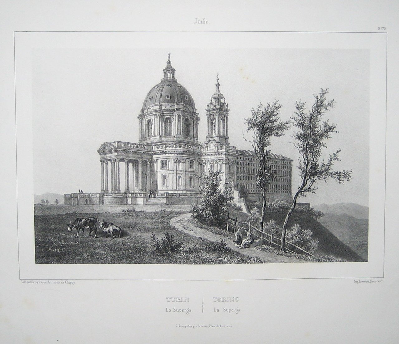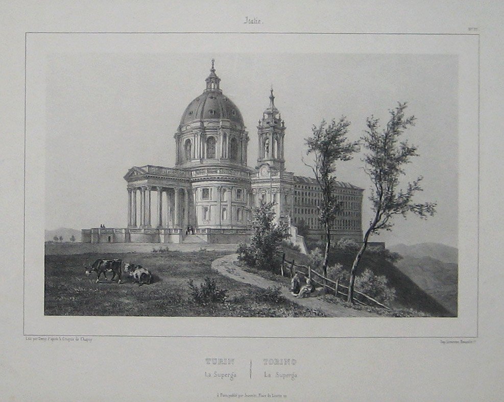 >Litografia originale (cm 32x43 compresi i margini bianchi), titolo in francese ed italiano al centro del margine inferiore. Sopra e sotto il titolo, i nomi degli artisti e le note tipografiche, al centro del margine superiore bianco, la scritta ''Italie''. Litografia firmata di Auguste Deroy su disegno di Nicolas-Marie-Joseph Chapuy tratta dalla raccolta ''L'Italie monumentale et pittoresque''. Veduta prospettica della Basilica di Superga, simile alla litografia di Chapuy nella quale però le mucche vennero sostituite da un gruppo di personaggi.
