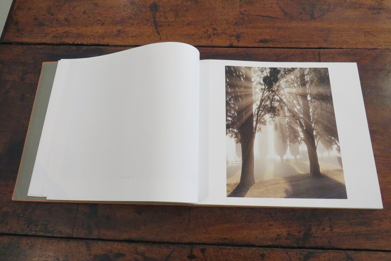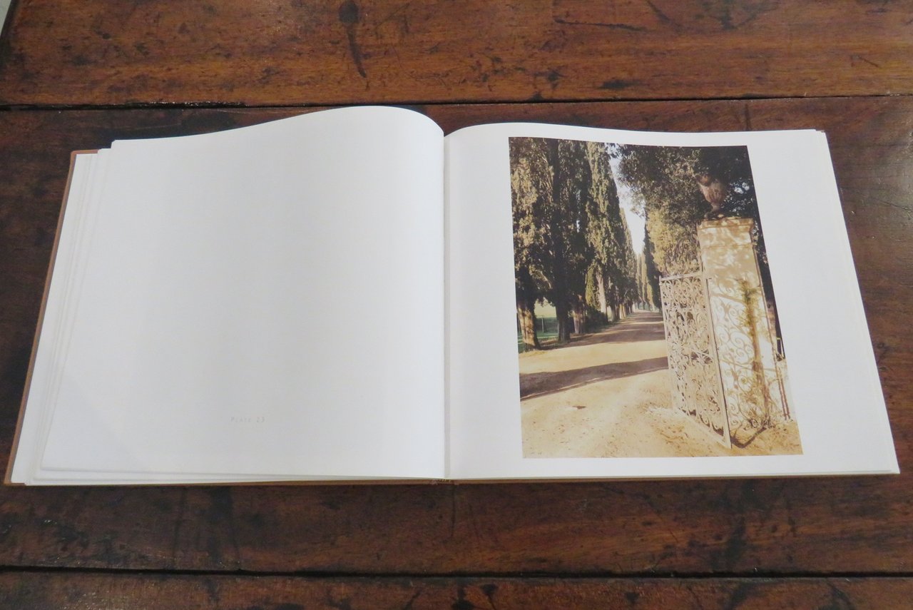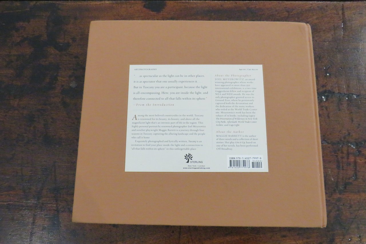 New York/London, Sterling, 2003. Formato album (mm. 320x280), con splendide, suggestive ed evocative 79 fotografie a colori a piena, a doppia e tripla pagina, che riproducono, attraverso le stagioni, nella loro magnifica luce, la campagna, i paesaggi della Toscana, la vita quotidiana delle persone e il loro profondo legame con la terra e il mondo rurale che li circonda. Tutte le fotografie sono corredate da un commento lirico e poetico, della scrittrice e drammaturga Maggie Barrett. Fotografie di Joel Meyerowitz. Legatura editoriale tutta tela arancione, con titolo e autori impressi in oro al piatto anteriore e al dorso, con foto a colori applicata. Inclusa sul retro del libro: "a fine art ready-to-frame photographic print" ("Castle Woods in Mist", 2010, di Joel Meyerowitz), conservata in busta chiusa in carta pergamena. Prima edizione. Ottimo.