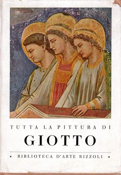 Tutta la pittura di Giotto, prima edizione dicembre 1952, formato 12,5 x 18.<BR>Copertina rigida di colore marrone chiaro con titoli in nero al piatto anteriore e al dorso. Sovraccoperta illustrata con titoli in nero. All'interno presenti numerose tavole illustrate in b/n. <BR>Lievi segni di usura alla sovraccoperta e al piatto anteriore. Nel complesso condizioni molto buone.