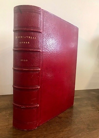 4to (cm. 21,3), 2 cc.nn., 441(1) pp., 4 cc.nn., 140 pp., 14 pp., 1 c.nn. bianca, 364 pp. (i.e. 362), 1 c.nn. bianca, 185(1) pp., 3 cc.nn. (di 7, assente la segnatura 2b4) con alcuni diagrammi n.t., (assenti 2 cc.nn., segnatura pi greco2), 189(1) pp., 1 c.nn. bianca. Oltre al frontespizio generale, sono presenti altri quattro frontespizi ognuno con il ritratto di Machiavelli in xilografia. Elegante legatura in marocchino rosso con nervi e titolo impresso in oro al ds. (firmata Duru 1847). Tagli dorati. Pur con la mancanza segnalata di alcune carte, esemplare in ottimo stato di conservazione, freschissimo e totalmente privo di fioriture e bruniture. Famosa edizione c.d. della Testina per le ripetute piccole immagini del busto dell’Autore sui diversi frontespizi. Le opere contenute sono: Le Historie fiorentine, Il Principe, La Vita di Castruccio Castracani, I Ritratti delle cose di Francia et della Alamagna, Discorsi sopra la prima deca di Tito Livio, I sette Libri dell’Arte della guerra, L’Asino d’oro, Clizia e Mandragola. Cfr. Bertelli S.-Innocenti P., Bibliografia machiavelliana, n. 20; Gamba, 623.