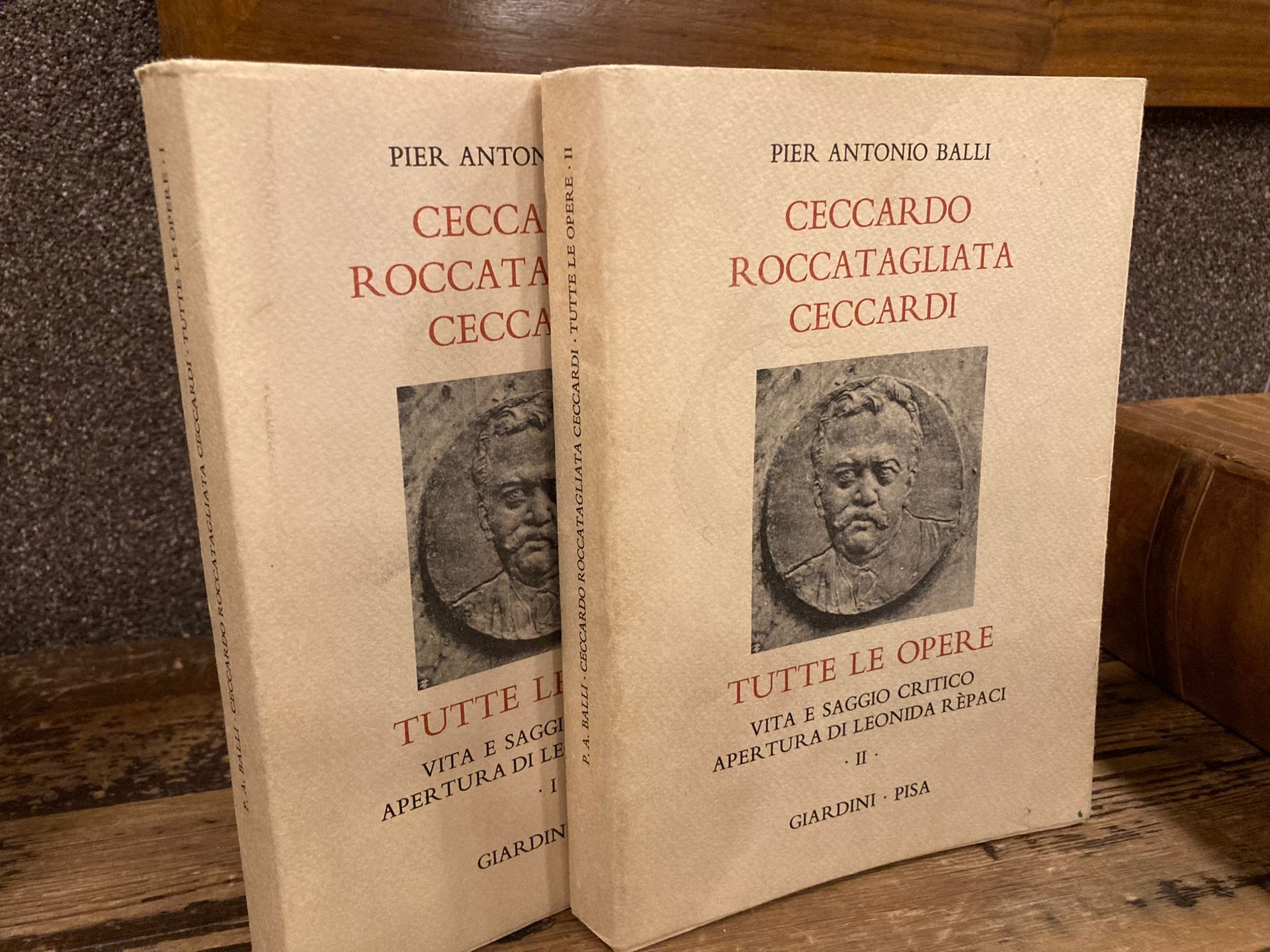 2 volumi in-8° (20x14 cm) con paginazione unica di pp. 793 (3), brossure editoriali con titoli in nero al dorso e in rosso e nero ai piatti figurati fotograficamente (scultura di Bistolfi raffigurante Ceccardo), il tutto ripetuto alle sovracoperte gemelle dei piatti. Tavole fotografiche ed illustrazioni b/n fuori testo. Lievi difetti alla sovracoperta del secondo volume; diffusi aloni e grinze di umidità a vari parti circoscritte di entrambi i volumi non fastidiose per la lettura. Buona copia da studio. Edizione critica di riferimento dell' opera omnia del controverso autore genovese d' origine ma carrarese d'adozione.