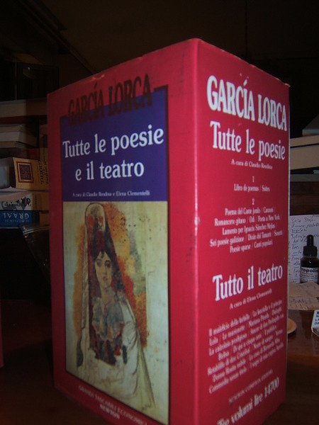 TUTTE LE POESIE E IL TEATRO. TESTO SPAGNOLO A FRONTE. 1? VOL. LIBRO DE POEMAS, SUITES;2? VOL. POEMA DEL CANTE JONDO, CANZONI, ROMANCERO GITANO, ODI, POETA A NEW YORK, LAMENTO PER IGNACIO S?NCHEZ MEJ?AS, SEI POESIE GALIZIANE, DIV?N DEL TAMARIT, SONETTI, POESIE SPARSE, CANTI POPOLARI;3? VOL. IL MALEFICIO DELLA FARFALLA, LA FANCIULLA E IL PRINCIPE, LOLA, LE MARIONETTE, MARIANA PINEDA, DIALOGHI, LA CALZOLAIA PRODIGIOSA, AMORE DI DON PERLIMPL?M CON BELISA, DI QUI A CINQUE ANNI, IL PUBBLICO, RETABLILLO DI DON CRIST?L, NOZZE DI SANGUE, YERMA, DONNA ROSITA NUBILE, LA CASA DI BERNARDA ALBA, COMMEDIA SENZA TITOLO, I SOGNI DI MIA CUGINA AURELIA.