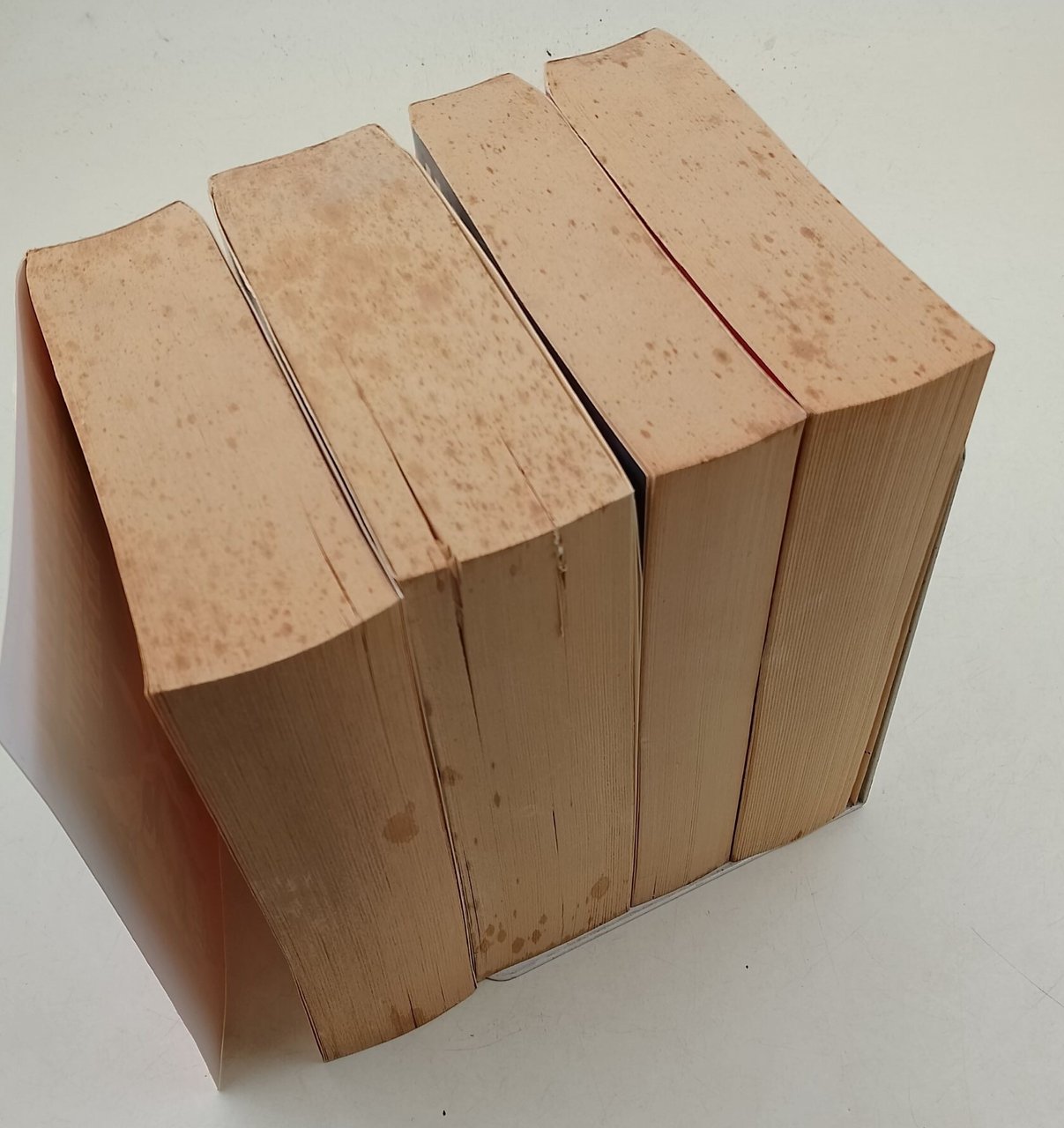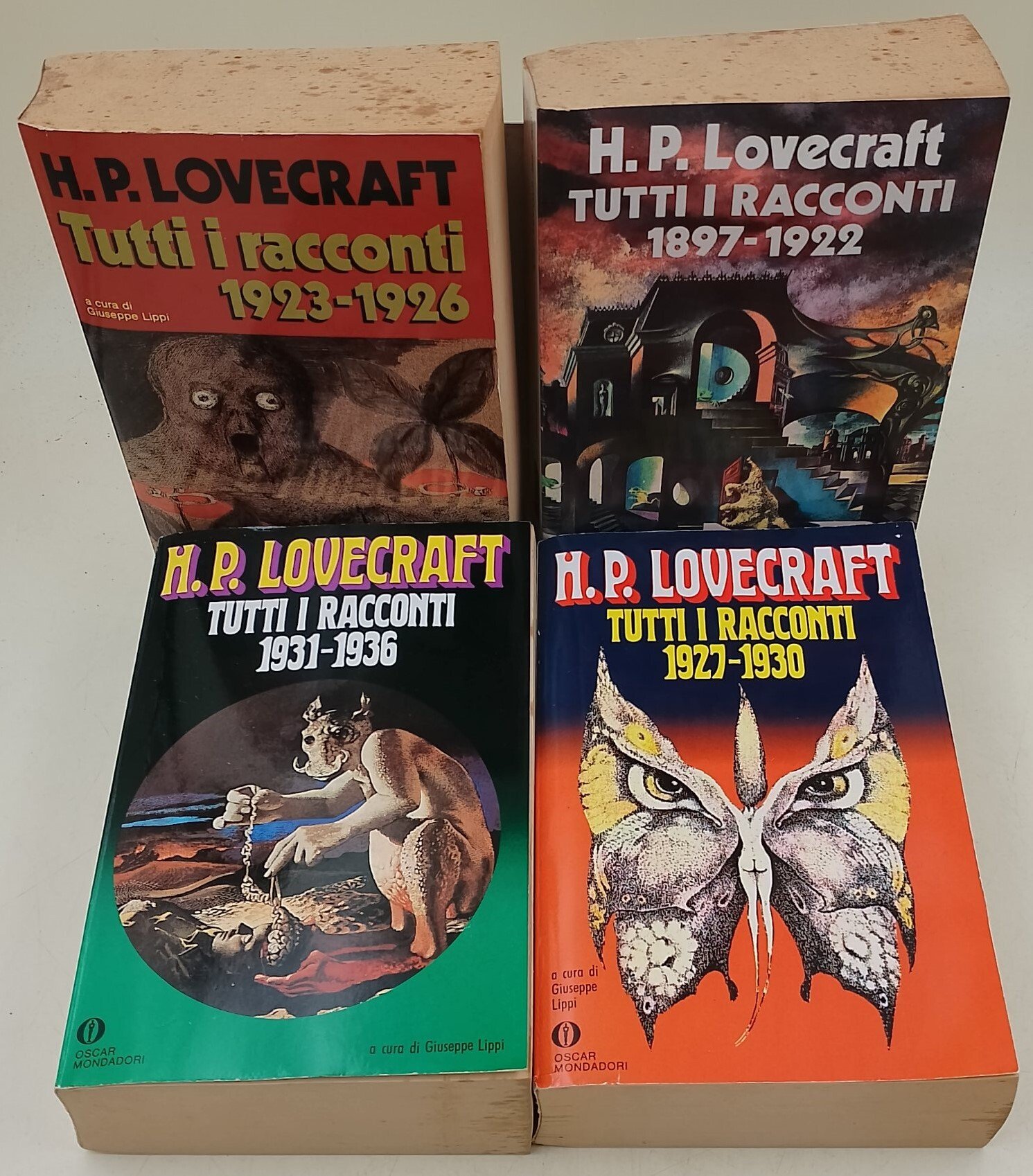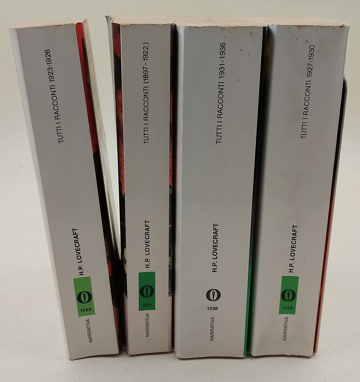 4 voll. in 8', br. ed., pp. LXVII, 415+ LXXXVI, 521+ LXXXVI, 581+ LXXXVI, 770; Tutti i racconti, dal 1897 al 1936, a cura di Giuseppe Lippi, edizioni dal 1989 al 1992, prime edizioni nella collana Oscar narrativa. Lievi segni d'uso alle op., tagli bruniti con presenza di fioriture e gore, interni in buono stato, lievemente brunito e con piccoli strappetti all'angolo sup. del IV vol. da p. 486 a p. 500. ***Due to bureaucratic reasons, books dated over 70 years old cannot be immediately exported, please contact us before placing the order.***
