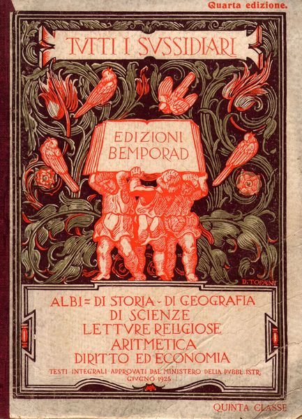 Edizioni Bemporad, Firenze, 1926, rilegato con bordo in tela rossa, pagine suddivise per albi. Quarta edizione. Tutti i sussidiari - per la 5a classe elementare: di storia, C. Alberici; di geografia, T. Trento; di scienze, V. Baldessaroni; letture religiose, V. Maione-Setti; aritmetica, G. Baldasseroni; dirito ed economia, M. Ami. Riproduzioni in b.n e alcune bellissime stampe a colori. (Manuali) BUONO stato.