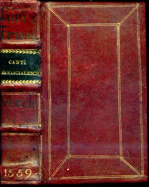 In-8° antico (168x98mm), pp. (28) bianche inserite dal legatore antico per consentire di apporre appunti, (20), 1-298, 397-465 [mancano le pp. 299-396], (6) di indice [l'ultima carta d'indice, assente nel testo a stampa, è calligrafata in antico, così come si presenta calligrafata l'errata], (24) bianche sempre per permettere di vergare degli appunti. L'esemplare si presenta, come assai spesso accade, mutilo di numerose pagine (quasi sempre le stesse nelle varie copie) in quanto la raccolta contiene molti componimenti liberi di carattere carnascialesco, ritenuti osceni per l'epoca (in realtà la maggior parte delle composizioni sono spiritosamente libere e scoppiettanti di doppi sensi) e, per tal ragione, amputati dalle copie per ragioni censorie. Legatura settecentesca in piena pelle rossa con bordure plurime di filetti rettangolari in oro ai piatti, raccordati fra loro da altri filetti longitudinali dorati. Dorso a tre nervetti con titolo in oro su tassello verde, filetti, anno di edizione e decori vegetali in oro. Tagli marmoreggiati rossi. Frontespizio xilografico con titolo entro bordura architettonica con putti, grottesche, telamoni e stemma mediceo coronato con motto entro cartiglio 'Inclita prole'. Frontespizio rifoderato. Sparse fioriture e arrossature. Alcuni forellini di tarlo al dorso. Possesso del celebre bibliofilo e studioso Gustavo Camillo Galletti (Firenze, 1805-ivi, 1868), la cui eccezionale raccolta fu fra le maggiori costituite da privati nell'Italia dell'800. Prima e assai rara edizione di questa celebre raccolta di componimenti toscani curata da Anton-Francesco Grazzini, detto il Lasca. Brunet, V, 988. Gamba, 264: 'Molto raro'. Renouard), III, p. 74. STC Italian, p. 370. Adams, F-614 (copia mutila). Ruble, 308. Razzolini, 85. Gay, III, 1820: Recueil contenant des pièces fort libres de Machiavel, de Laurent de Médicis, du cardinal Divizio, etc.. Graesse, VII, 217: 'Cette édition doit être employée à côté de la première. Olschki, Choix, 2913. Ceresoli, 129. Melzi, III, 181-182. Moreni, II, 141. Lensi, Il gioco del Calcio fiorentino, n. 2, nota.