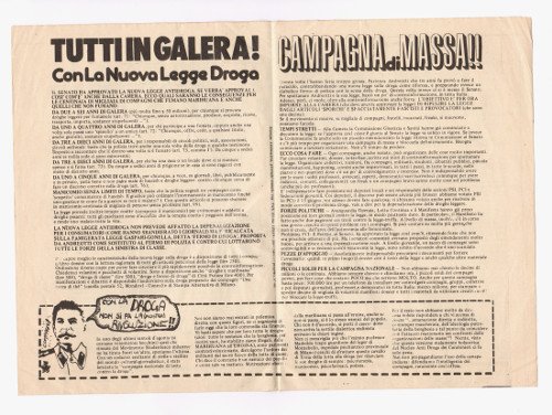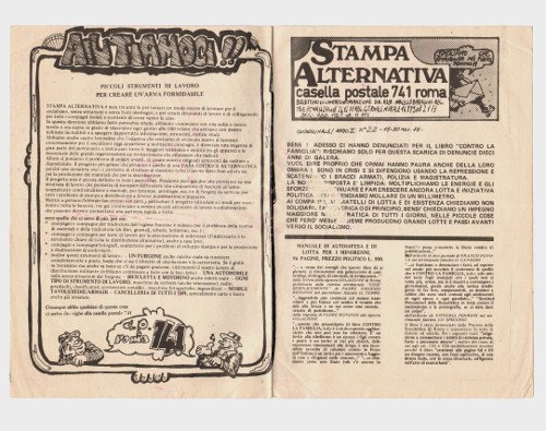 Foglio singolo ripiegato (cm 50x35) pag. 4 -- Stampa Alternativa è una casa editrice romana fondata nel 1970 sull'esempio delle Alternative Press americane e inglesi, guidata da Marcello Baraghini si propone come un'agenzia di controinformazione e un centro di servizi su tematiche fino ad allora ignorate sia dalle forze istituzionali, sia dai movimenti che si autodefinivano rivoluzionari: sessualità, droghe, energie rinnovabili, viaggi e, più in generale, qualità della vita.