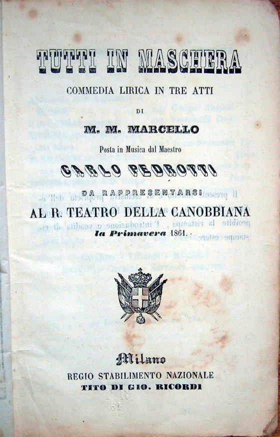 Tutti in maschera. Commedia lirica in tre atti di M. M. Marcello posta in musica dal Maestro Carlo Pedrotti, da rappresentarsi al R. Teatro della Canobbiana la Primavera 1861