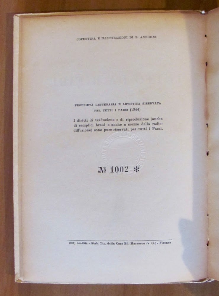 Copertina a colori e 8 tavole monocromatiche f.t. di Ezio Anichini. Casa Editrice Marzocco - Firenze, 1944. Edizione Numerata, nostro N.1002. Cartonato editoriale con usure alle cerniere del dorso. Spellamento della carta alle cerniere interne delle sole copertine. Peraltro pagine freschissime e pulite. 15,5x22; pp.230. Raro e in Buono stato. , Buono (Good)