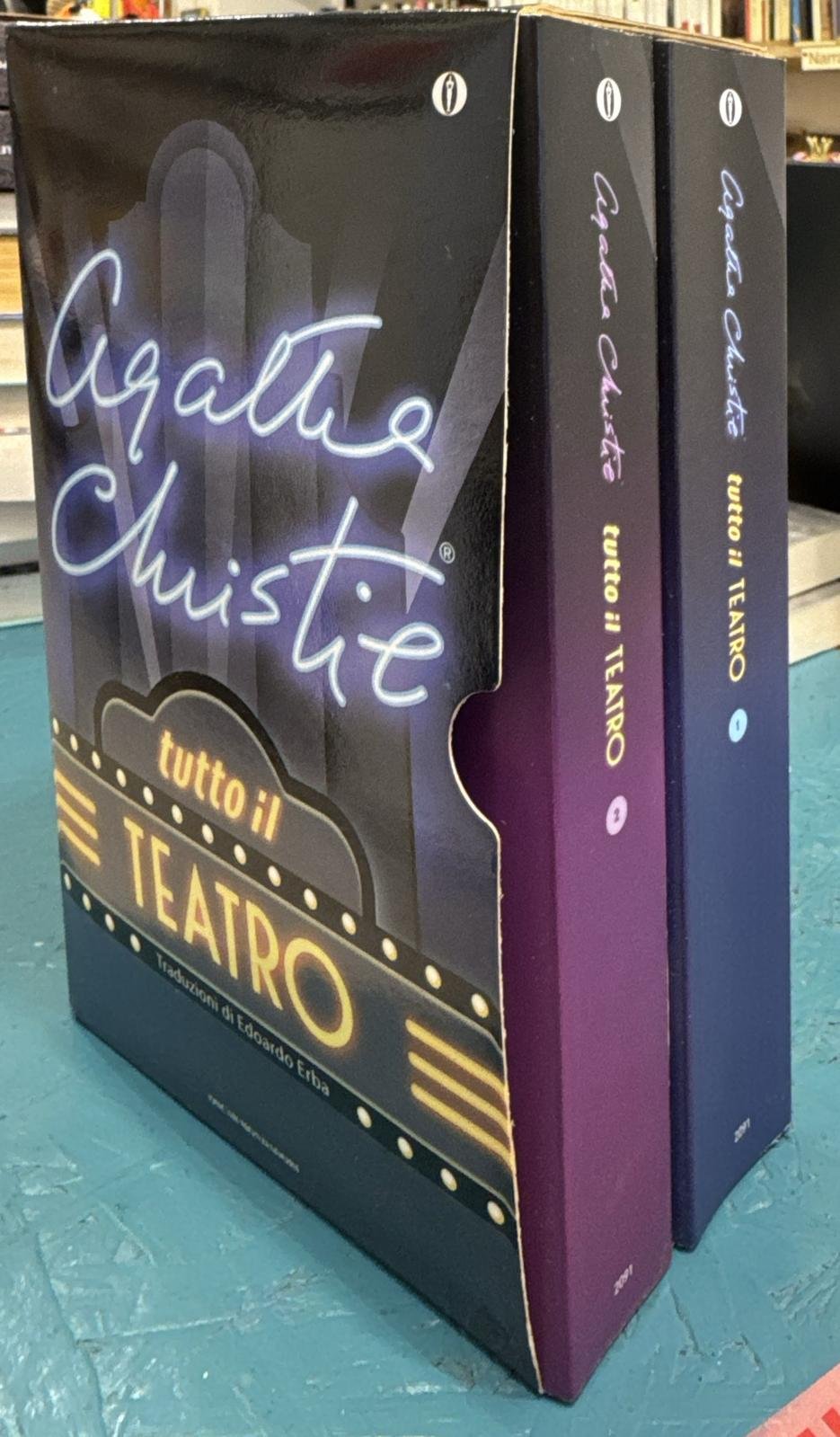 Obiettivo della nuova edizione di "Tutto il teatro" di Agatha Christie è valorizzare i testi teatrali della regina del giallo non solo ai fini della loro (godibilissima) lettura, ma anche in funzione della loro messa in scena. La ritraduzione di tutti i drammi è firmata Edoardo Erba. // Traduzioni di Edoardo Erba. Stato di conservazione: buono, qualche lieve fioritura ai tagli, ma libri preservati bene anche per la presenza del cofanetto