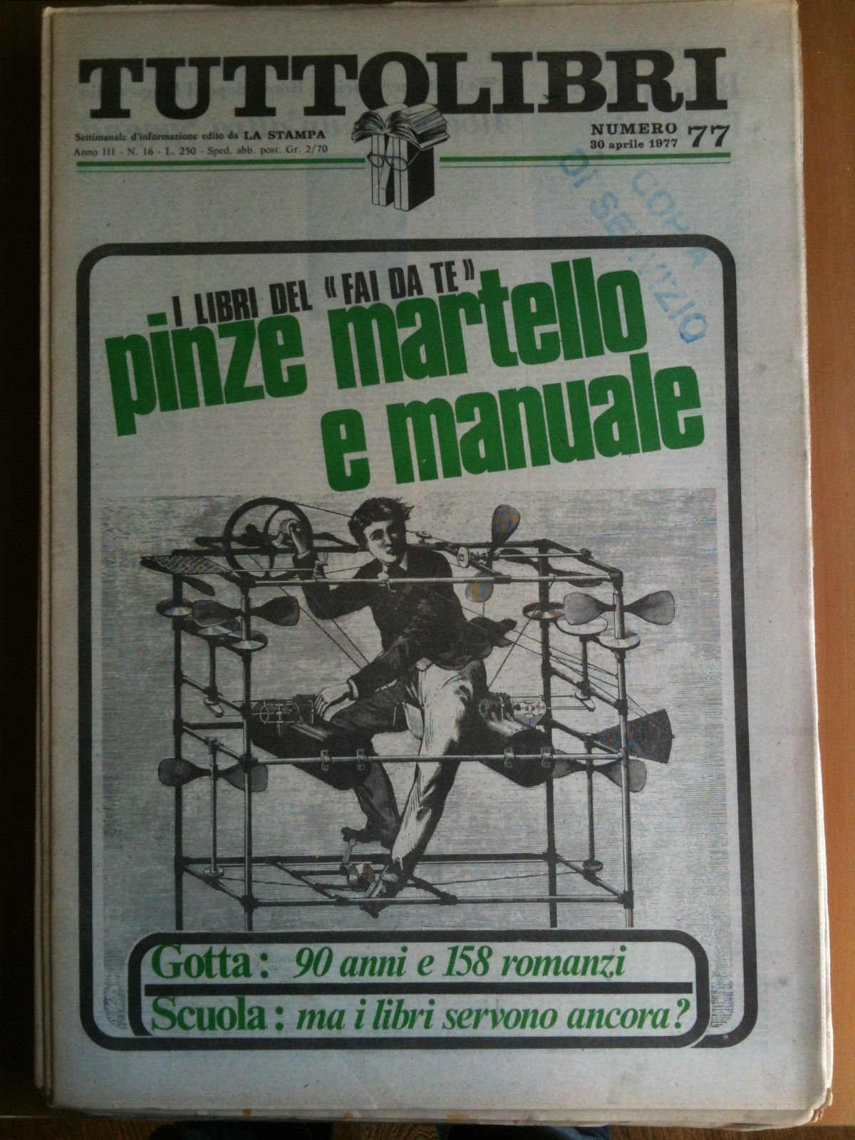 TUTTOLIBRIAnno III n^ 77 - 30 Aprile 1977Settimanale d'informazione edito da La StampaGotta: 90 anni e 158 romanzi - Alberti, in un'altra Spagna - Marrou, da Sant'Agostino alle battaglie di "Esprit" - Marino il geniale - Pindaro il sommo - Rilke alchimista: poesia e mistero24 pagine formato 30x43 cm (75 g)E2523