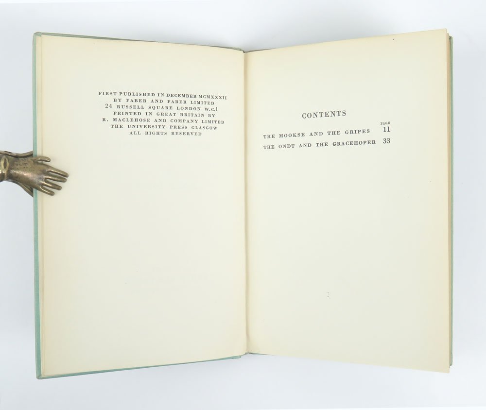 LIBROPrima edizione.Ottimo esemplare (non presente la sovracoperta).Due brevi racconti di Joyce, «The Mookse and the Gripes» e «The Ondt and the Gracehoper», poi confluiti in «Finnegan’s Wake».Slocum & Cahoon, Joyce Bibliography, A37