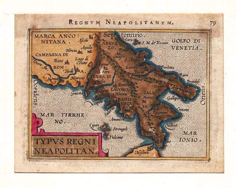 Piccola carta geografica, coloritura a mano coeva, cm. 11 x 8 all'immagine più i margini. Carta geografica dell'Ortelius in edizione ridotta, testo in latino sul retro. Abraham ORTELIUS, Anversa, 1528 - 1598 assieme a Mercatore è stato un importante cartografo fiammingo.