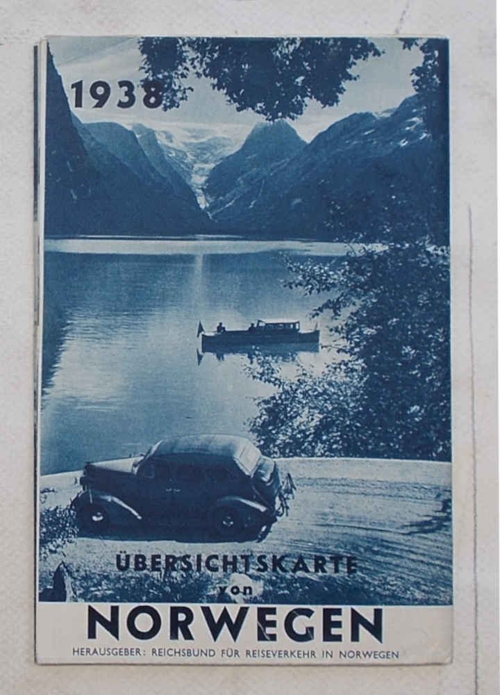 Pieghevole di 32 facciate di cm. 18 x 12; con, su un lato completamente aperto, grande carta a colori della Norvegia in scala 1:1.600.000; al verso numer. illustraz. fotograf. in tinta; copertina grafica e fotografica. VG+. ** In tedesco.