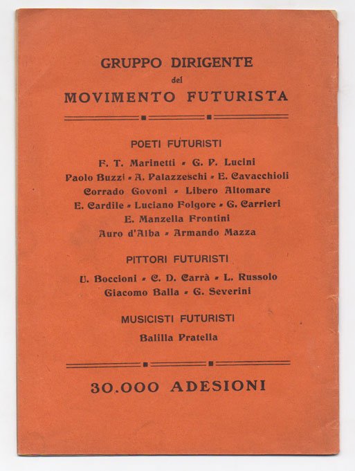 LIBROPrima edizione così.Ottimo esemplare (alla brossura millimetrica mancanza all’angolino alto anteriore della brossura e minime fioriture), integro, fresco e pulito; condizione non comune per questo tipo di edizione.«.Sentimmo a un tratto la Luna carnale, la Luna dalle belle coscie calde, abbandonarsi languidamente sulle nostre schiene affrante. Su udì gridare nella solitudine aerea degli altipiani: — Uccidiamo il chiaro di luna!» -- Prima apparizione di questo titolo in italiano. Questo lungo manifesto/proclama fu il secondo mai elaborato dal Marinetti futurista, subito a seguire il manifesto di fondazione. Fu concepito nell’estate del 1909 e pubblicato in una placchetta diffusa via posta nel settembre 1909, con un bellicoso titolo in copertina: «La Rassegna internazionale “Poesia” pubblica questo proclama in reazione agli insulti con cui la vecchia Europa ha gratificato il Futurismo trionfante». Si trattava, come si evince da questo strillo, di un bilancio della ricezione del futurismo, soprattutto in Francia, che fu estremamente negativa, ai limiti del dileggio conclamato. Marinetti reagiva alzando la posta con un nuovo proclama estremamente lirico e provocatorio, che era anche un modo per delineare un primo nucleo di futuristi a cui il poeta si rivolge in apertura: «Olà! Grandi poeti incendiari, fratelli miei futuristi!.». Nel settembre 1909 l’elenco era ridotto a Buzzi, De Maria, Cavacchioli, Govoni e Altomare; qui si contano diciassette nomi (con Lucini al posto di De Maria). -- Il proclama fu subito tradotto in francese come «Tuons le claire de lune!» nell’ultimo numero di «Poesia», diffuso a fine 1909. Venne quindi ripubblicato solo nel 1911 con quel titolo voltato in italiano, a ridosso «della rissa con i vociani del 22 giugno 1911» (Tonini).Cammarota, Marinetti, 29; Tonini, I manifesti, 3.5