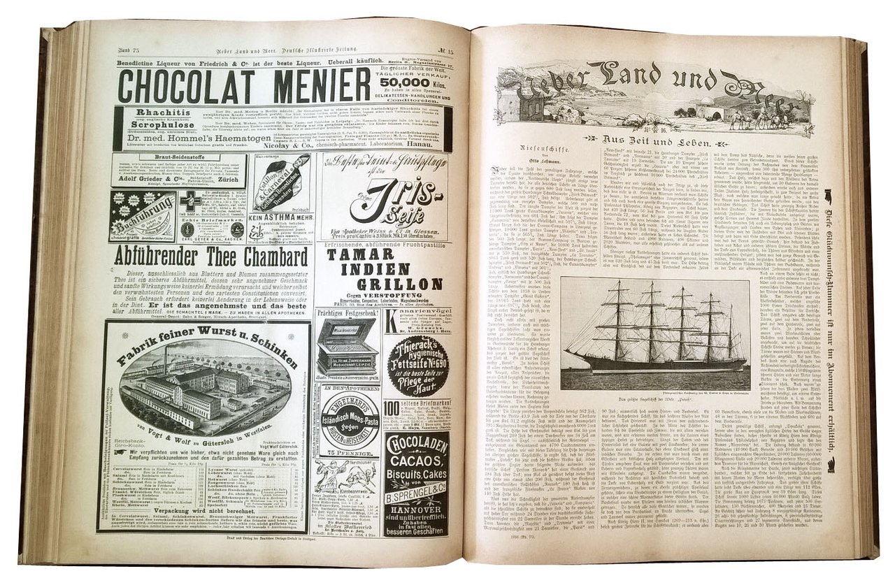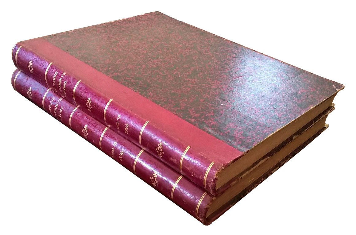Folio (386x288 mm), contemporary full leather binding, gilt title at spine; 2 vols; pp. 840. COMPLETE COLLECTION OF THE ILLUSTRATED ENTERTAINMENT JOURNALS “UEBER LAND UND MEER”, ISSUED IN 1896 AND BOUND IN TWO VOLUMES. Ueber land und meer [“Over land and sea”] was an illustrated entertainment Journal, which first appeared in Stuttgart in 1858 in folio format and later in octave format. It was published since 1923. The weekly paper was subtitled General Illustrierte Zeitung and had therefore refer to the model, the successful Illustrierte Zeitung. The content was humoristic and should entertain but also educate. Particularly important was the link with many pictures. The weekly newspaper was founded by the successful author Friedrich Wilhelm Hackländer and the Stuttgart publisher and bookseller Eduard Hallberger. Since 1881, the magazine was published by the German publishing house, then from 1888 was subtitled Deutsche Illustrirte Zeitung. Ref.: IT\ICCU\TO0\0182713. OCLC, 48896995. Cond.: Light traces of use. Very good set.