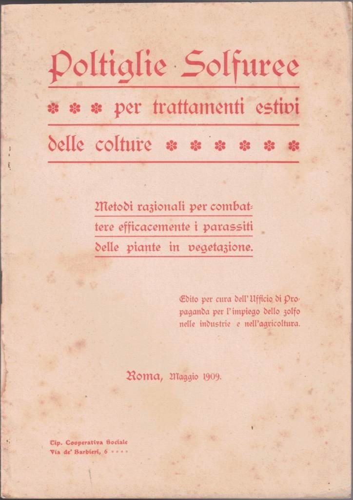 Poltiglie solfuree per trattamenti estivi delle colture. Metodi razionali per combattere efficacemente i parassiti delle piante in vegetazione, edito per cura dell’Ufficio di Propaganda per l’impiego dello zolfo nelle industrie e nell’agricoltura, Tip. Cooperativa Sociale, Roma 1909, pp. 29, testatine ill. b.n., cm 24, pubblicazione spillata. Alla prima di copertina: edito per cura dell’Ufficio di Propaganda per l’impiego dello zolfo nelle industrie e nell’agricoltura. Al frontespizio: Ufficio Sulphur, Roma. Minime fioriture, per il resto ottimo.