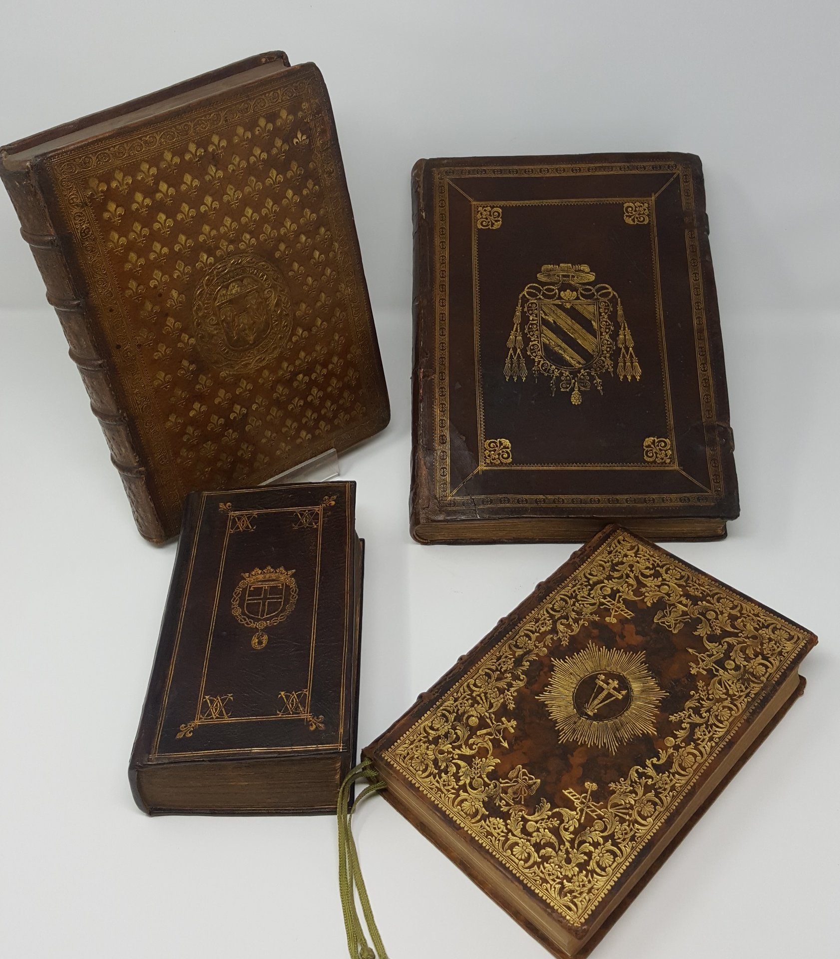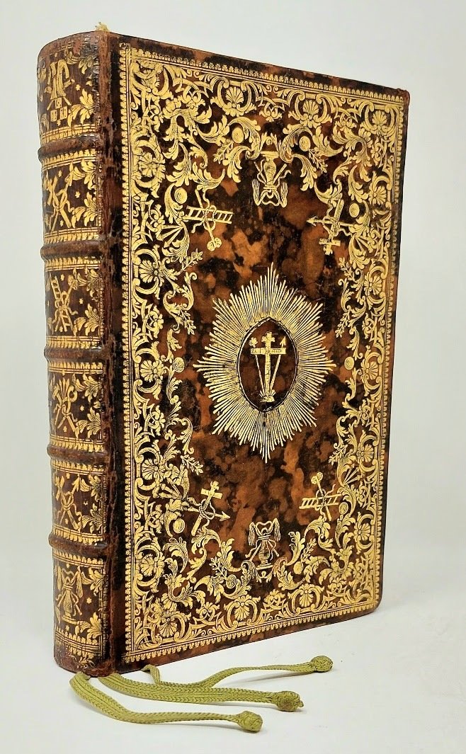 >in-8 (210x140 mm), pp. XXX, 598, con 13 tavole incise a p. pagina f.t e numerose vignette n.t.; Frontispizio e testo stampati in rosso e nero. Vignetta con ritratto di Cristo calcogr. sul front. Spettacolare legatura coeva in vitello maculato, riccamente ornata ai piatti con larga bordure vegetale e dentelle in oro, al centro medaglione con la croce incorniciata da un'aureola di raggi luminosi, sempre in oro. Dorso a nervi lavorato in oro a piccoli ferri, che ricorrono anche ai piatti, modellati per rappresentare i passaggi fondamentali della passione di Cristo (la tunica giocata a dadi dai soldati, la croce e la lancia del centurione nel costato di Gesù, la scala usata per deporre il Cristo e la spugna imbevuta di aceto, i tre chiodi della crocifissione con martello e tenaglia, la brocca usata da Pilato per il lavaggio delle mani e i flagelli). Tagli dorati. Buon esemplare, assai fresco, in magnifica legatura d'amatore.