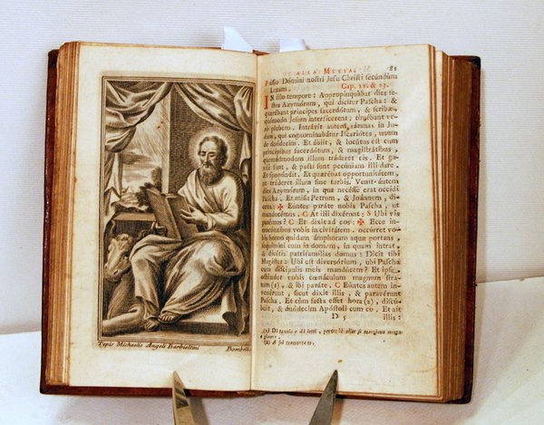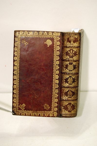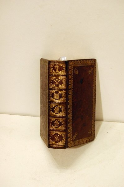 [FIGURATO LEGATURA] (cm.16,8) Bella legatura originale in pieno vitello bruno a 5 nervi, ricchi fregi in oro, specchi con 6 simboli della passione entro filetti e fiorami. piatti con filetti, dentella e rotella a palmette alternate agli angoli ancora simboli della passione, scala dadi, tunica, sindone, croce, ecc.Sguardie decorate, tagli dorati. -pp.XVI, pp.511. Frontis rosso e nero con incisione. All'interno varie incisioni su rame di Bombelli. testo stampato in rosso e nero, i rami interni portano la scritta: "Typis Michaelis Angeli Barbiellini". Circa l'incisore, Pietro leone Bombelli (Roma, 1737-1809) Vedi Benezit II 501. Esemplare molto bello in ogni sua parte.[f37]
