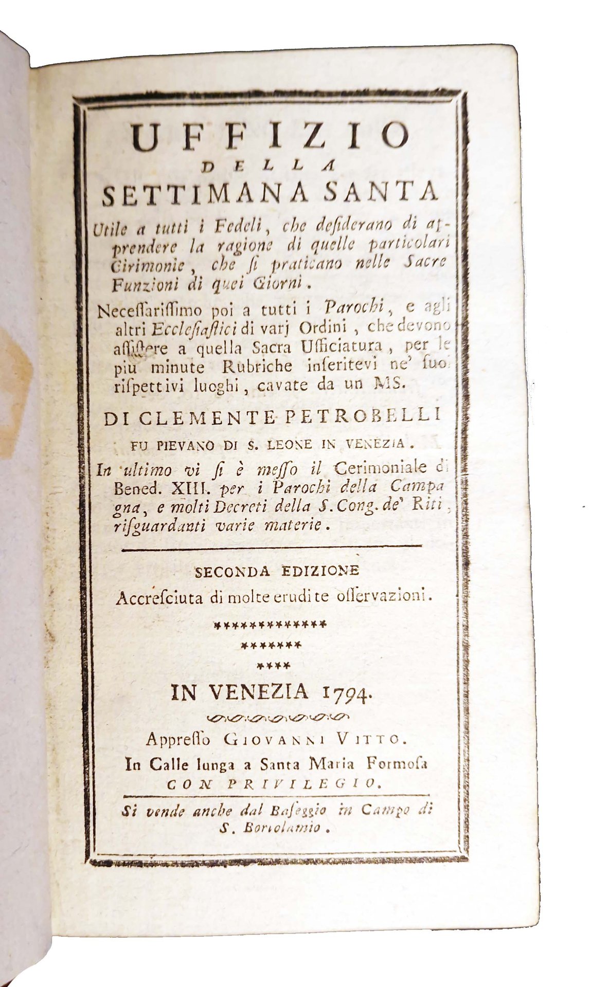 Uffizio della settimana Santa utile a tutti i fedeli, che desiderano di apprendere la ragione di quelle particolari cirimonie, che si praticano nelle sacre funzioni di quei giorni. […] Di Clemente Petrobelli […] In ultimo vi e messo il Cerimoniale di Bened. XIII. per i parochi della campagna […]. Seconda edizione accresciuta di molte erudite osservazioni.