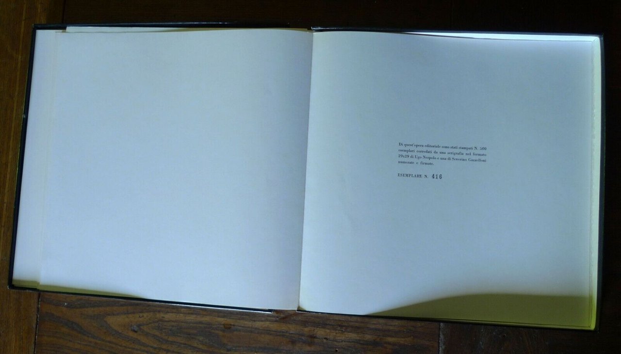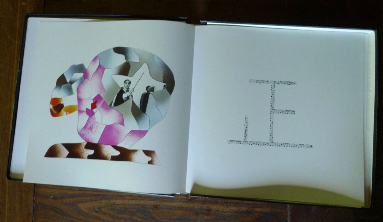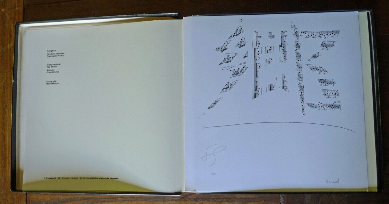 UGO NESPOLO - SEVERINO GAZZELLONIPre-Art, Milano 1977,Direttore Editoriale Giampaolo Prearo,tiratura di 500 esemplaricorredati da una serigrafia nel formato29x29 di Ugo Nespolo (1/100) e una diSeverino Gazzelloni (75/100) numerate e firmate,ESEMPLARE N.416,cofanetto in cartoncino rigido illustrato 30x30 cm., fogli sciolti ripiegati contenenti.2 serigrafie, un ritratto fotografico dei 2 artisti,un testo introduttivo di Luca M. Venturi,tavole a colori di soggetto musicale,peso: kg. 1,4