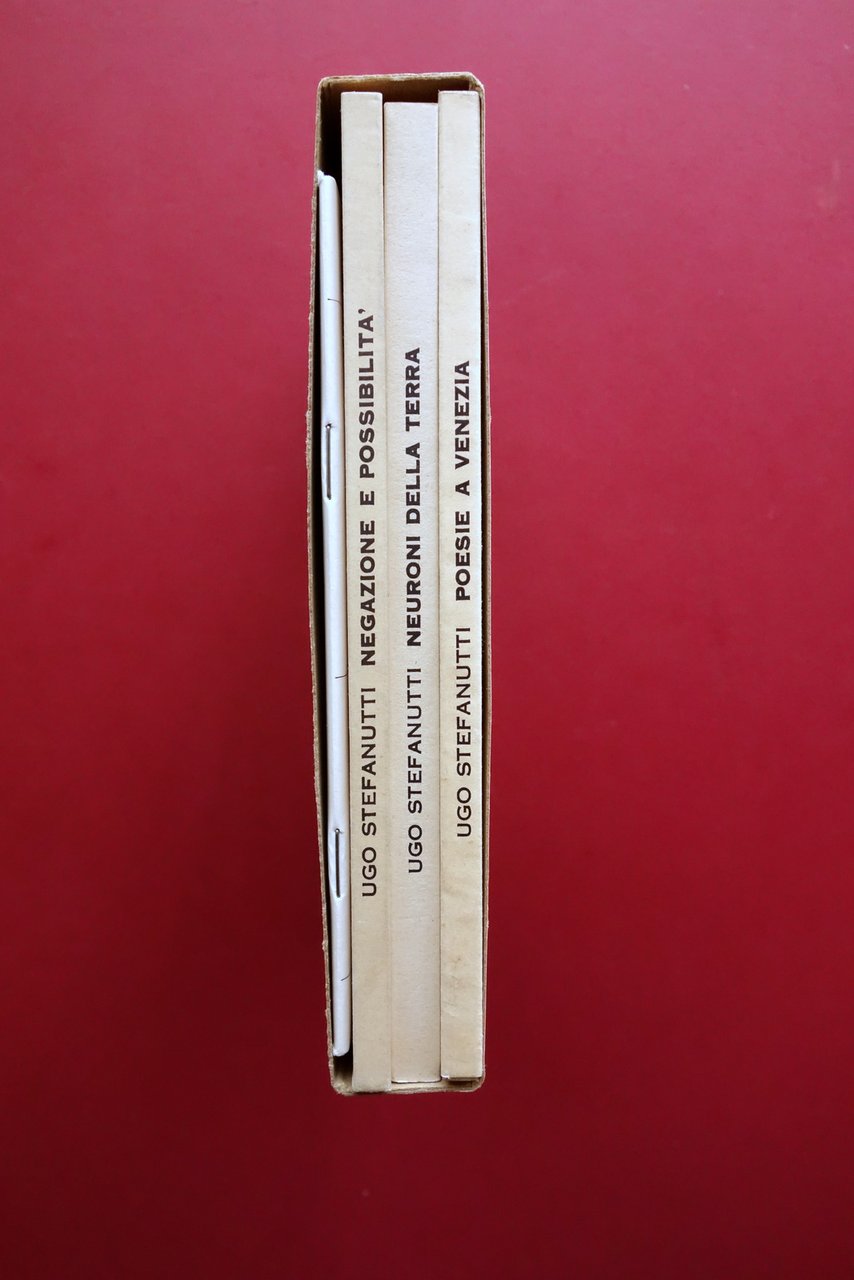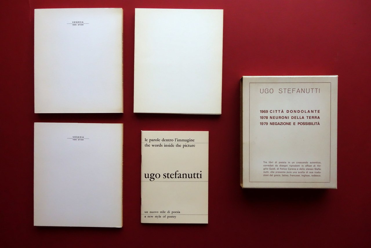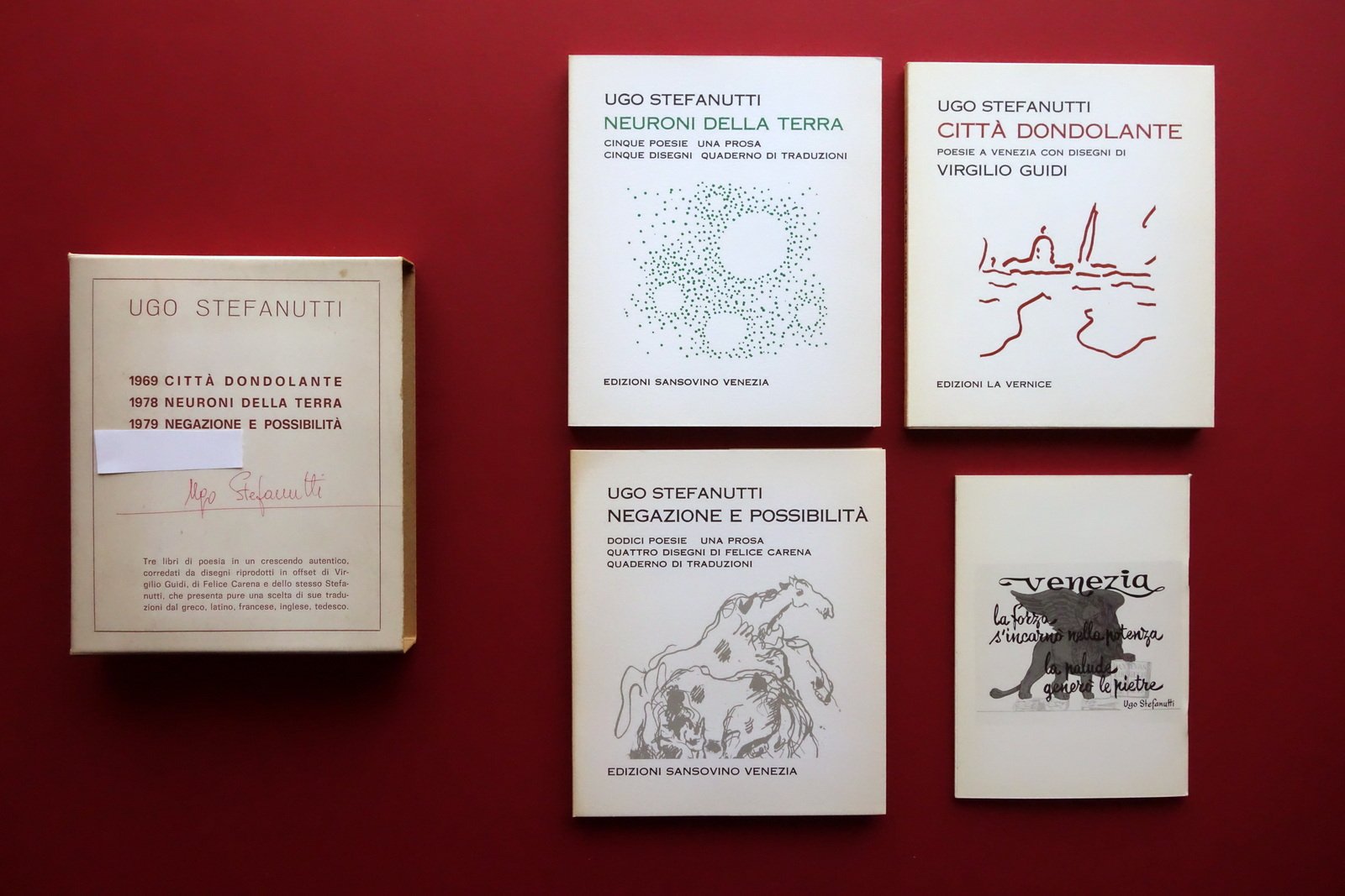 Ugo Stefanutti, Città dondolante poesie a Venezia con disegni di Virgilio Guidi *** Neuroni della Terra cinque poesie - una prosa - cinque disegni - quaderno di traduzioni *** Negazione e possibilità dodici poesie - una prosa - quattro disegni di Felice Carena - quaderno di traduzioni *** Le parole dentro l'immagine / the worlds inside the picture Edizioni La Vernice, Venezia 1969; cm 19x16; pp. 70 con ill. in b/n di Virgilio Guidi; brossura ed. con bandelle (Città Dondolante); Edizioni Sansovino, Venezia 1978; cm 19x16; pp. 92 con ill. in b/n; brossura ed. con bandelle (Neuroni della Terra); Edizioni Sansovino, Venezia 1979; cm 19x16; pp. 82 con quattro ill. in b/n di Felice Carena; brossura ed. con bandelle (Negazione e possibilità); I tre volumetti sono corredati di cofanetto ed. in cartoncino con, a un piatto, dedica autografa dello Stefanutti a penna rossa. Accluso opuscolo Ugo Stefanutti - Le parole dentro l'immagine, cm 17x12,5, pp. 32 non num. con ill. in b/n. Condizioni di conservazione Volumetti tutti e tre in condizioni più che buone con minime tracce di utilizzo, minimamente ingialliti ai dorsi e, in misura minore, ai margini della brossura. Opuscolo Le parole dentro l'immagine molto ben conservato. Cofanetto ed. in buone condizioni con alcune minime leggerissime tracce di sporco. Bella raccolta delle prime tre opere poetiche in volume dello Stefanutti, inserite entro cofanetto editoriale. Tutte illustrate, Città Dondolante" in particolare presenta illustrazioni in bianco e nero di Virgilio Guidi, mentre "Negazione e possibilità" reca quattro disegni in bianco e nero di Felice Carena. Accluso un ulteriore opuscolo sullo Stefanutti e la sua opera letterario-artistica. Al cofanetto dedica autografa dello Stefanutti a penna rossa. SETT228.L25035 N "