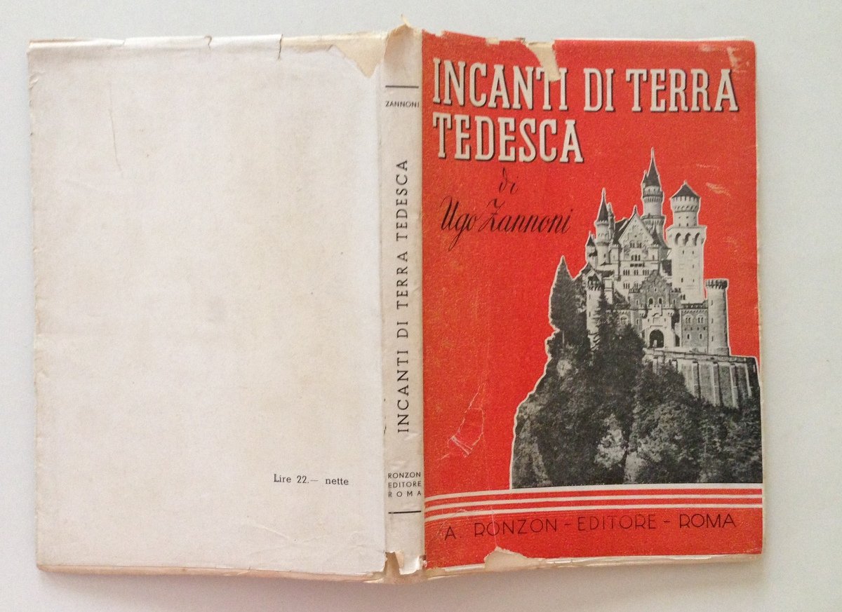 Ugo Zannoni, Incanti di Terra Tedesca Ronzon Editore, Roma 1942, cm 22,5x15,5, pp.175, ill. in b/n a p.pag., timbro omaggio Associazione Italo-Germanica di Venezia alla prima bianca, cartoncino ed. con sovracop. ill. Condizioni di conservazione Esemplare in buono stato con tracce d'uso; sovracopertina editoriale con qualche abrasione ai piatti e alcune mancanze ai margini e al dorso; cartoncino editoriale con qualche macchia di brunitura e con minime pieghette ai margini, agli angoli e al dorso; interni buoni con bruniture. SETT100.L9467 MT